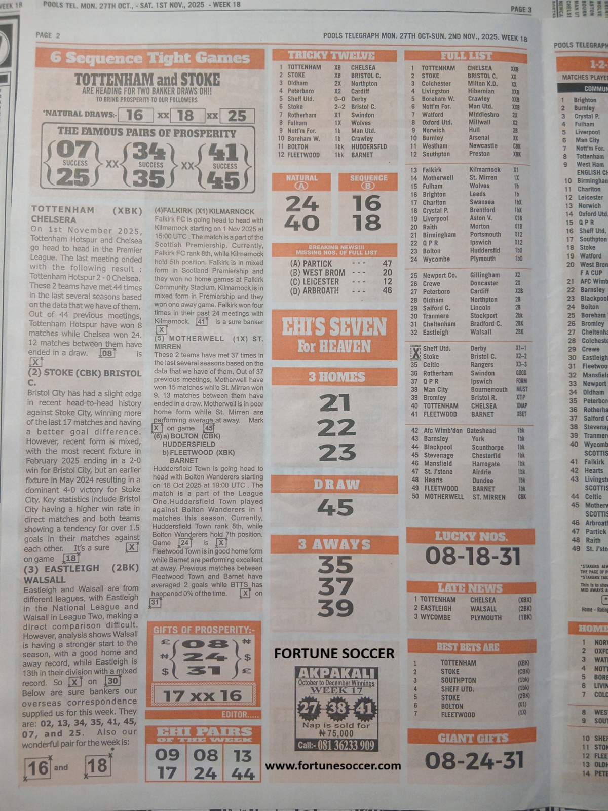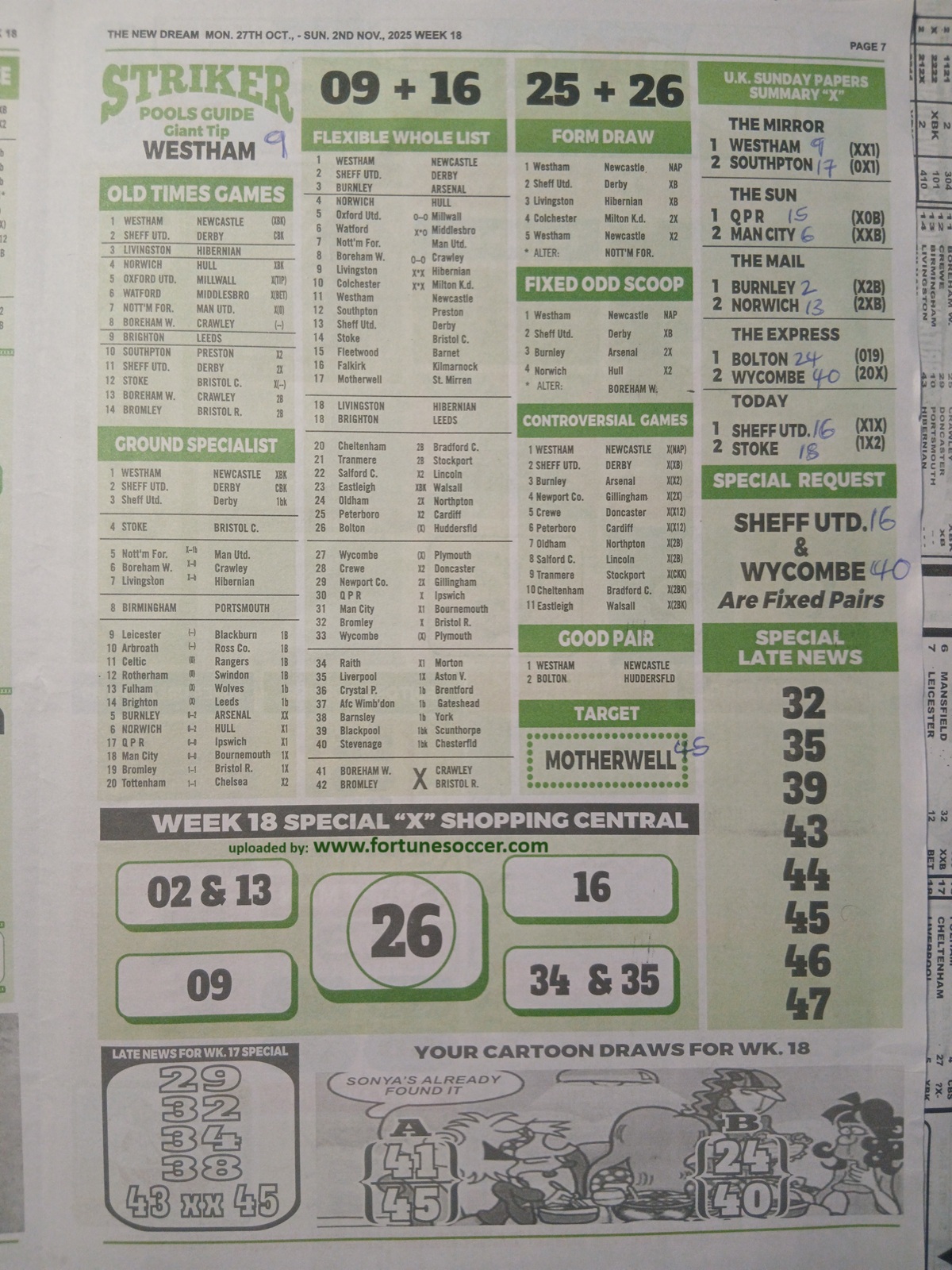 - Week 18 Pool Late News Papers for matches scheduled on Saturday, 1 Nov 2025, in the UK 2025/2026 season.
