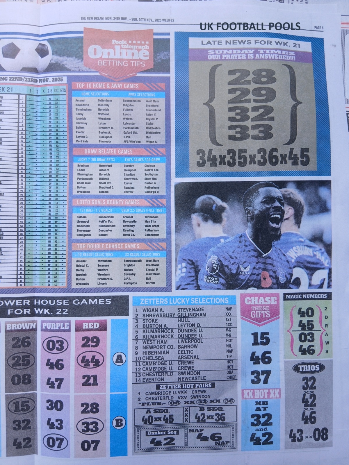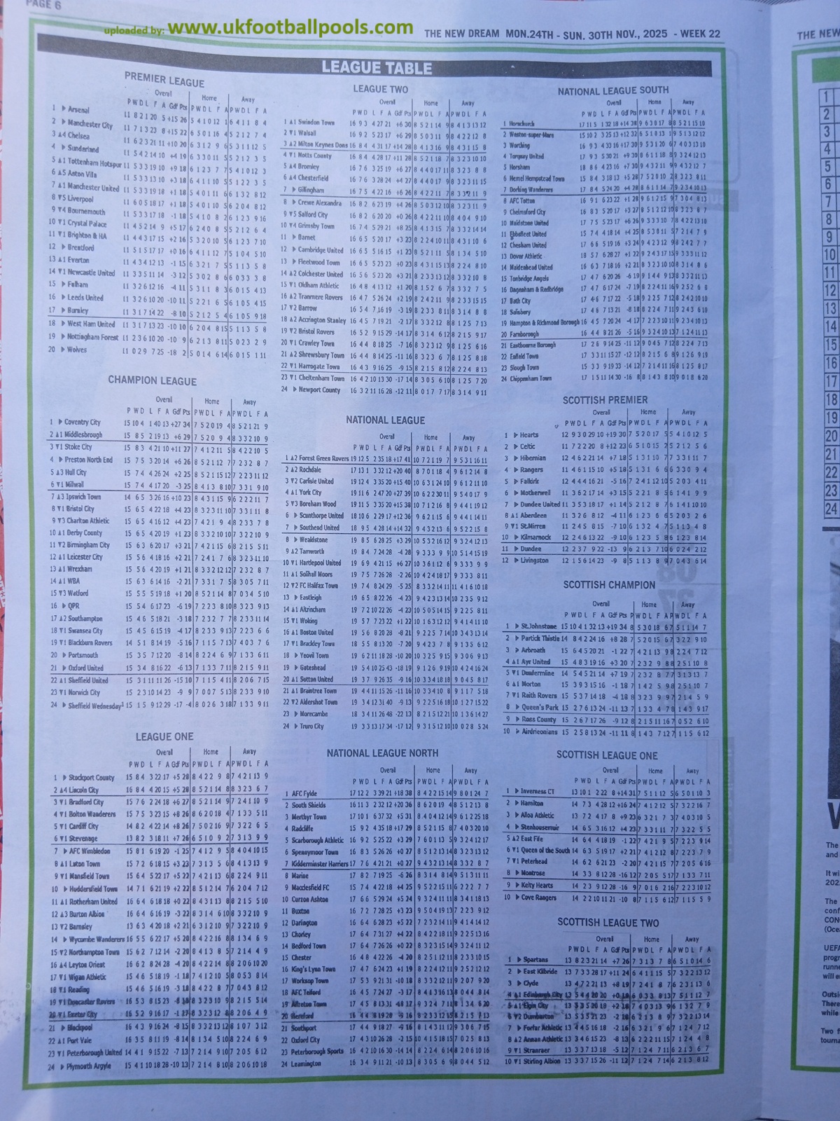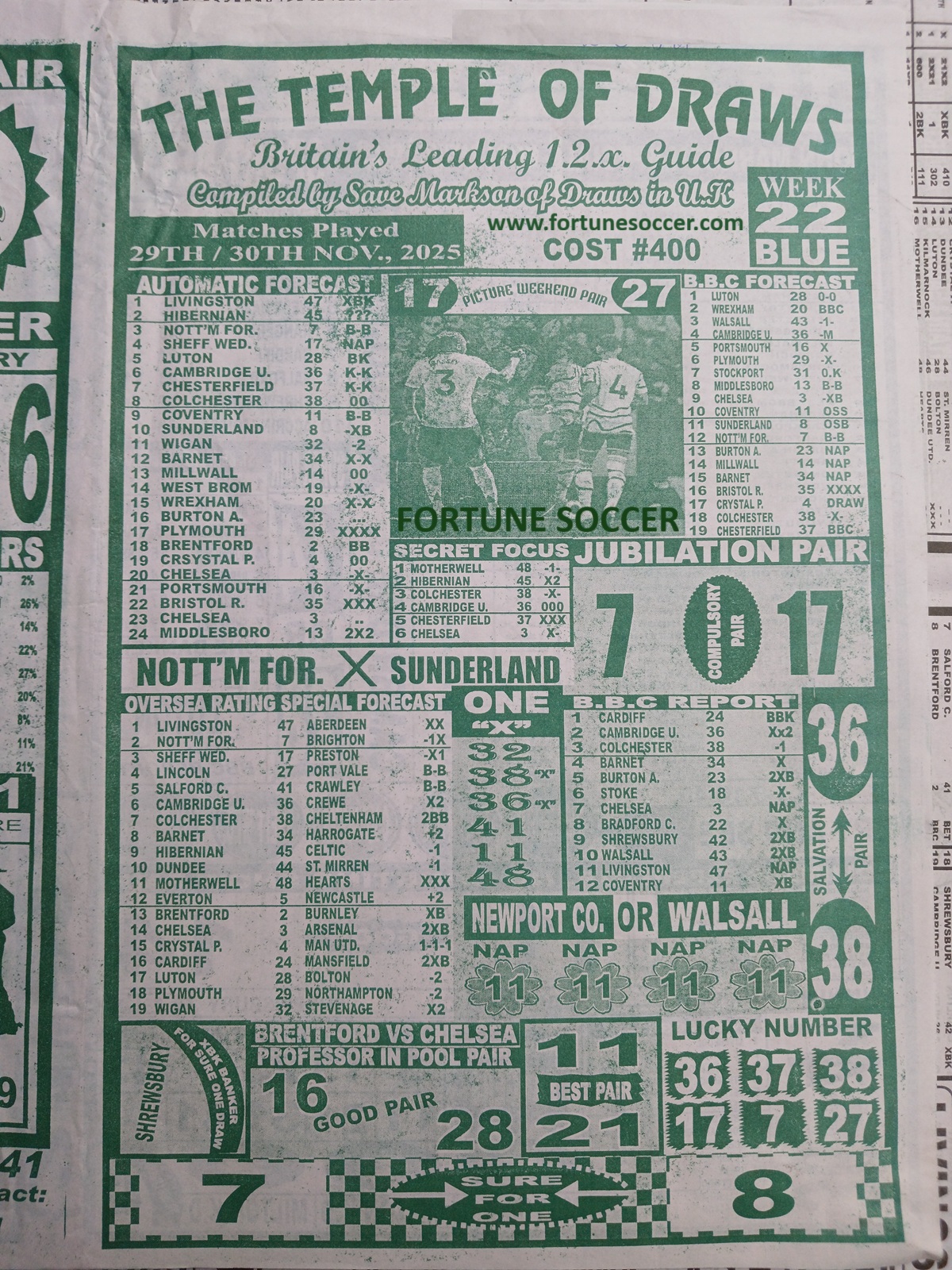 Week 22 Pool Late News Papers for matches scheduled on Saturday, 29 Nov 2025, in the UK 2025/2026 season.