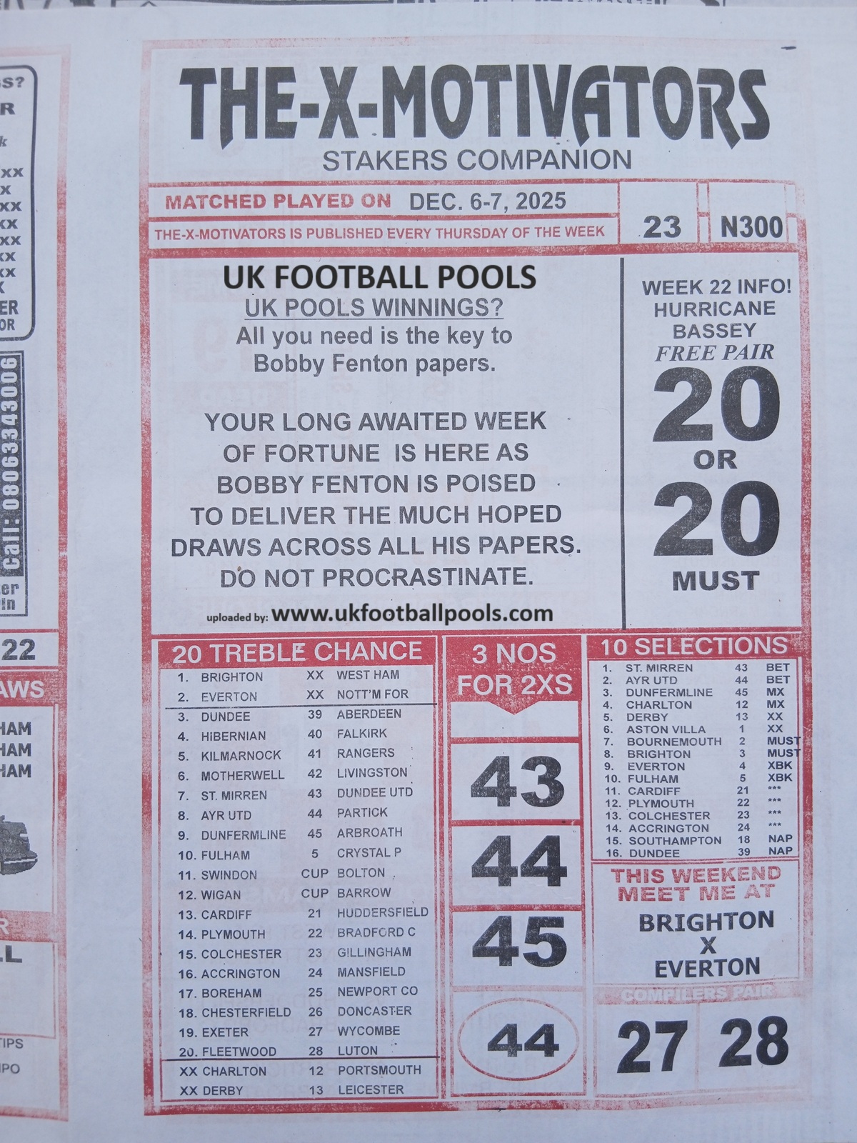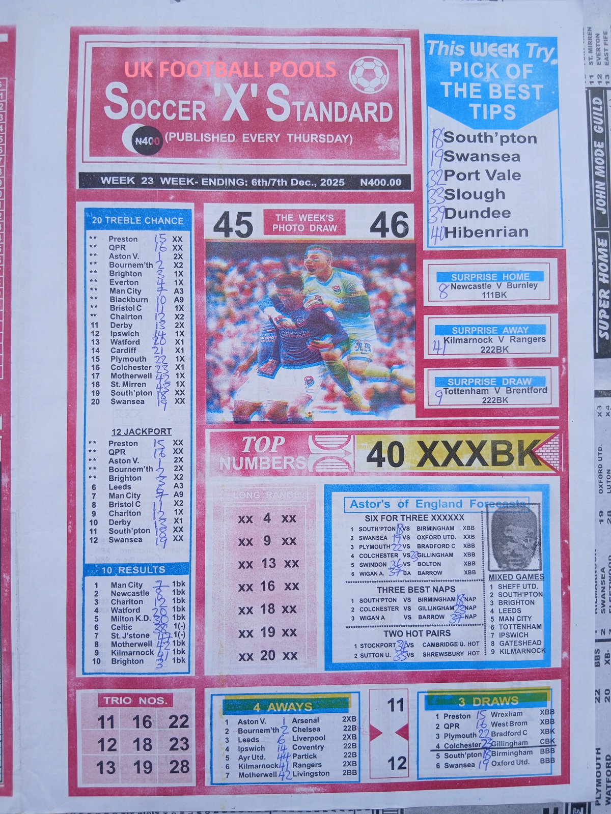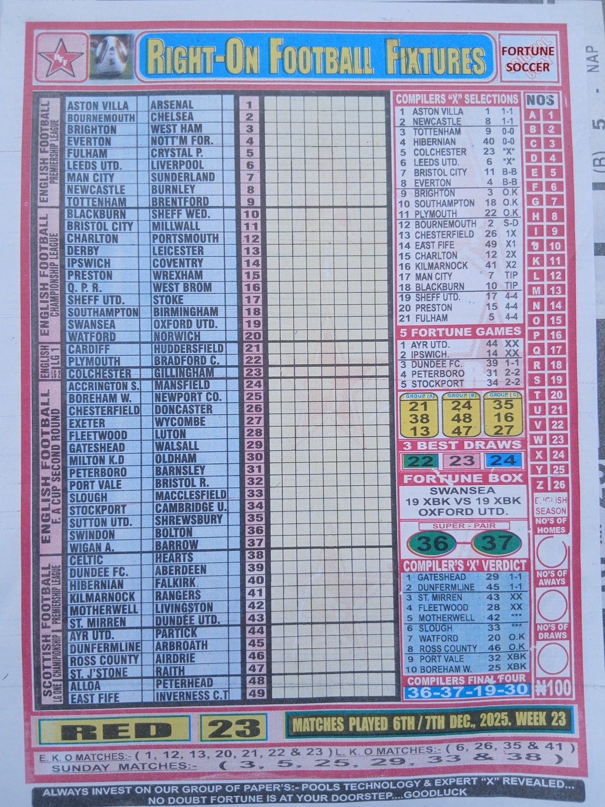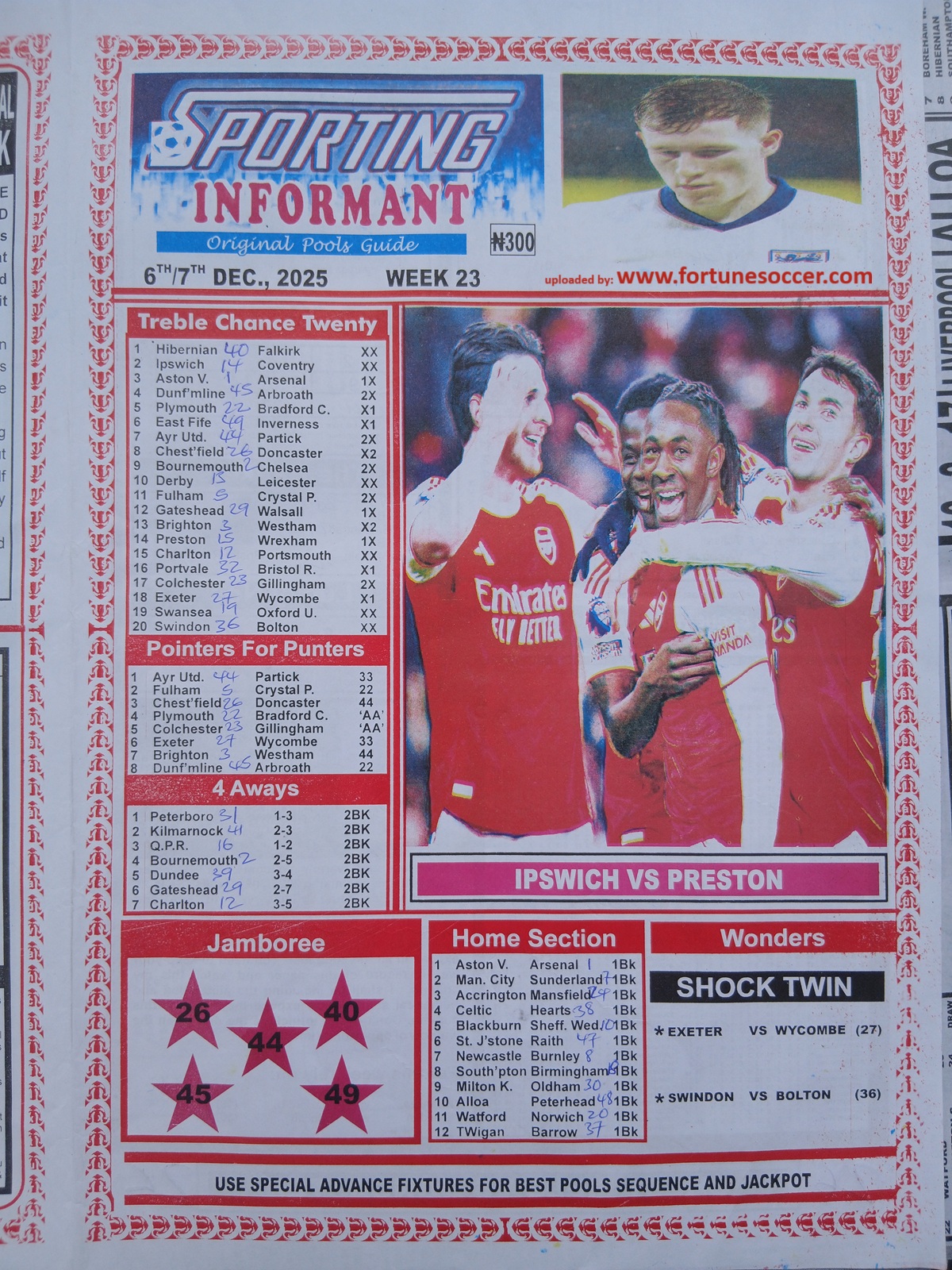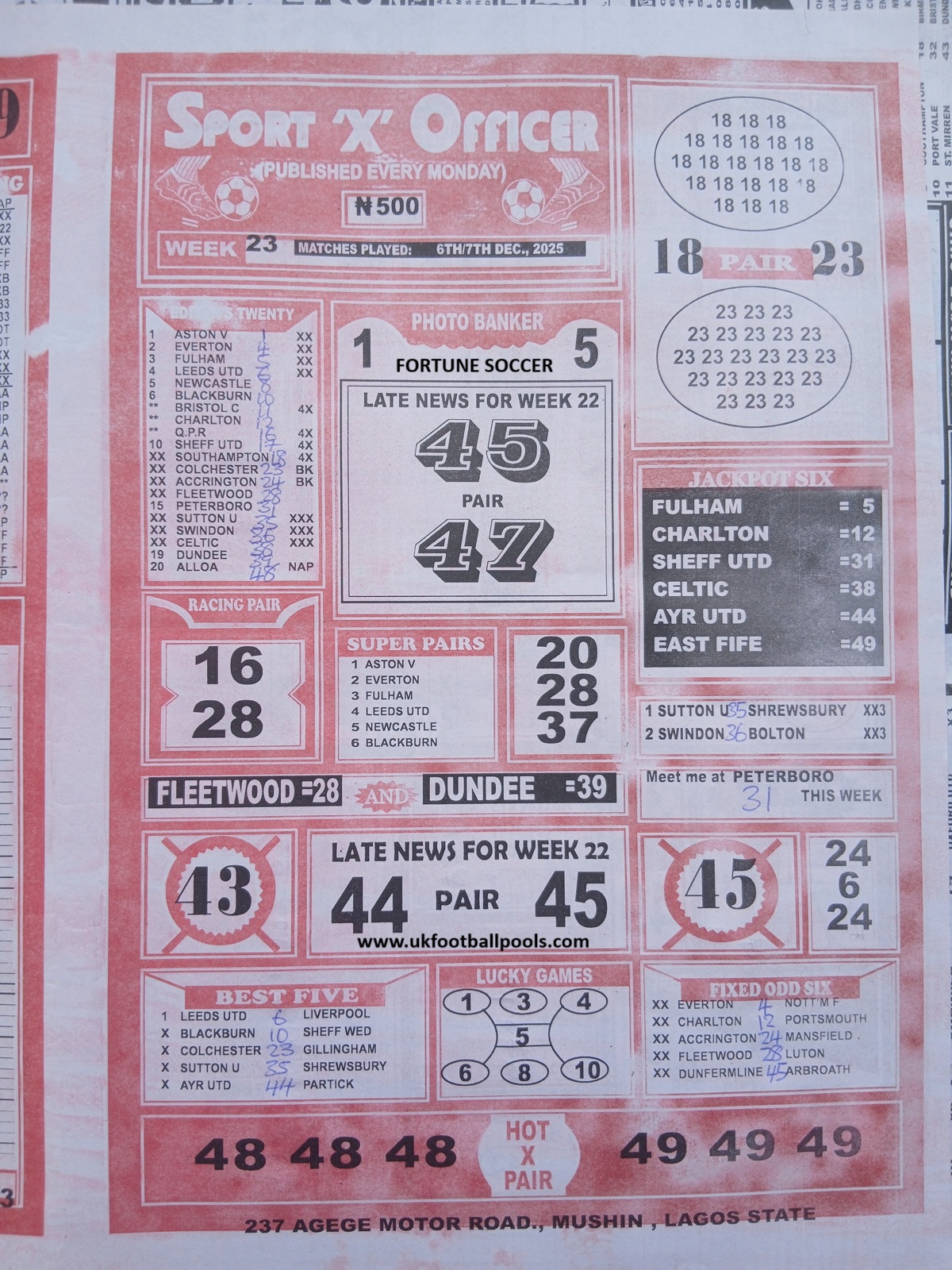 Week 23 Pool Late News Papers 2025: Sport Officer, Soccer Standard for matches scheduled on Saturday, 06 Dec 2025, in the UK 2025/2026 season.