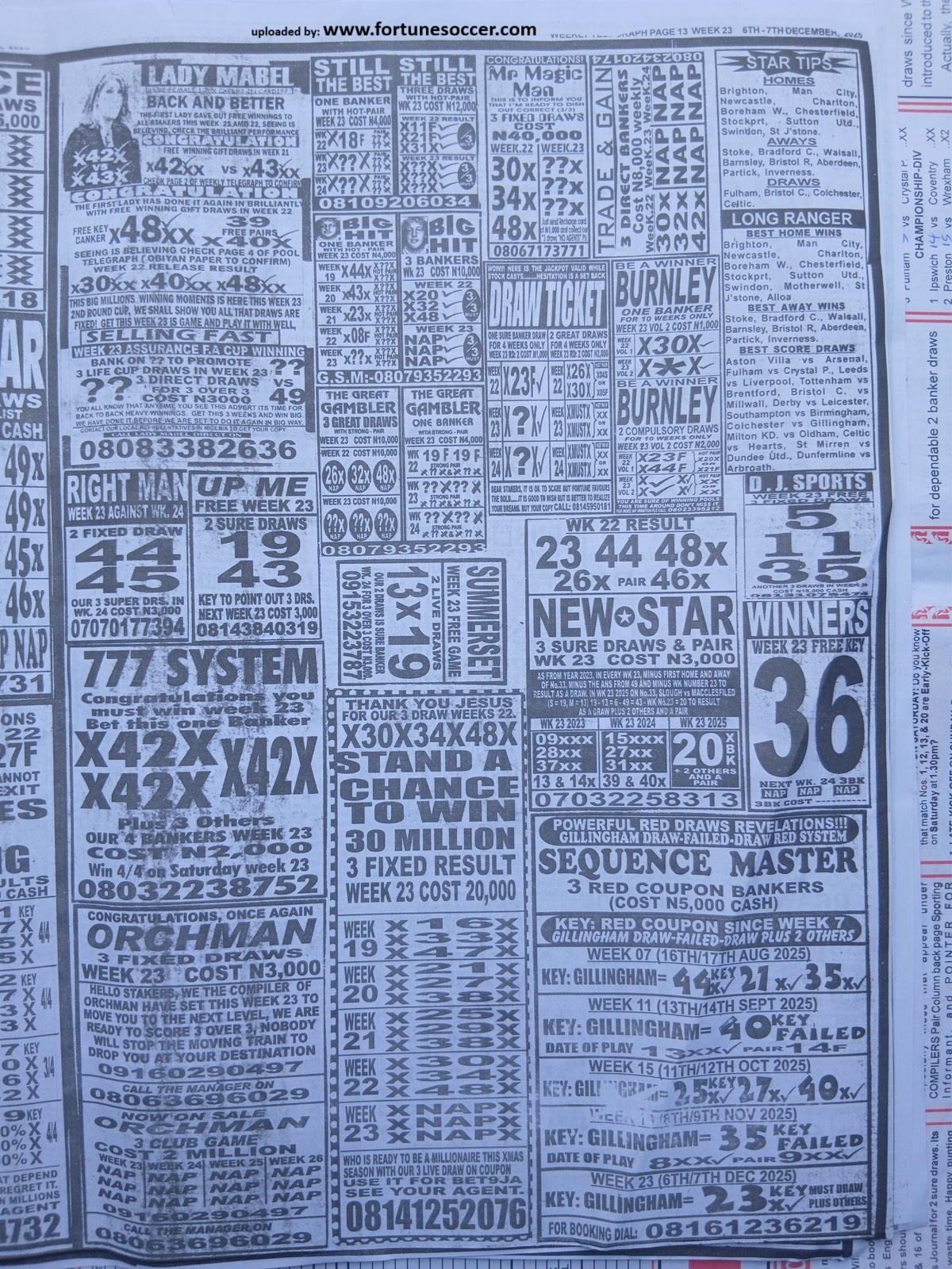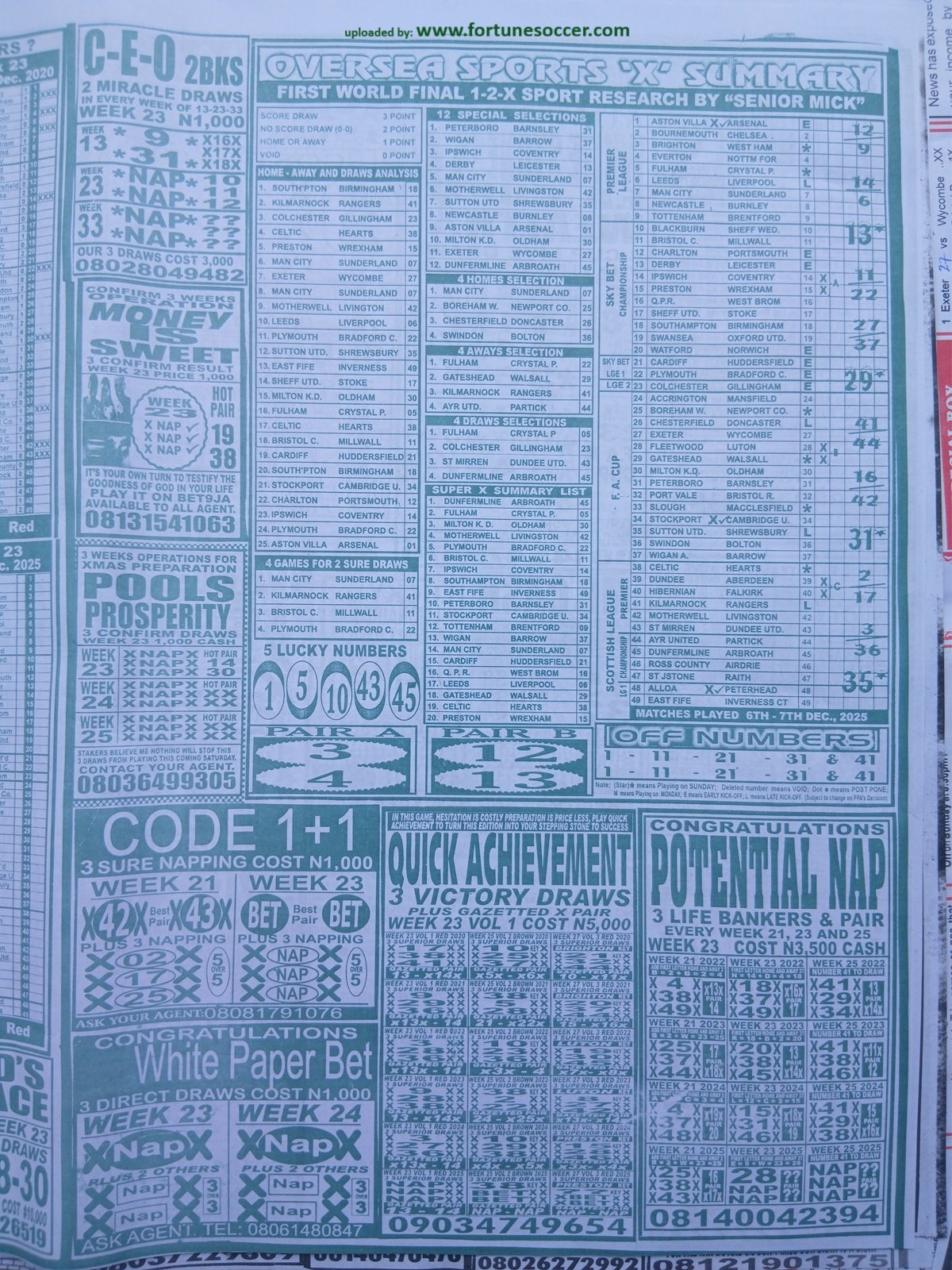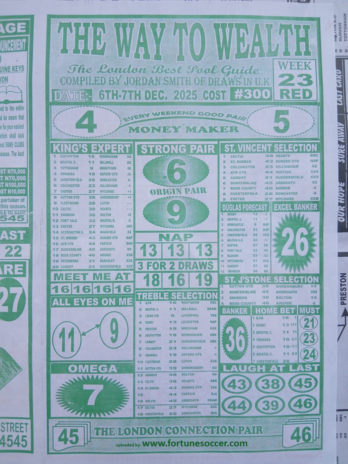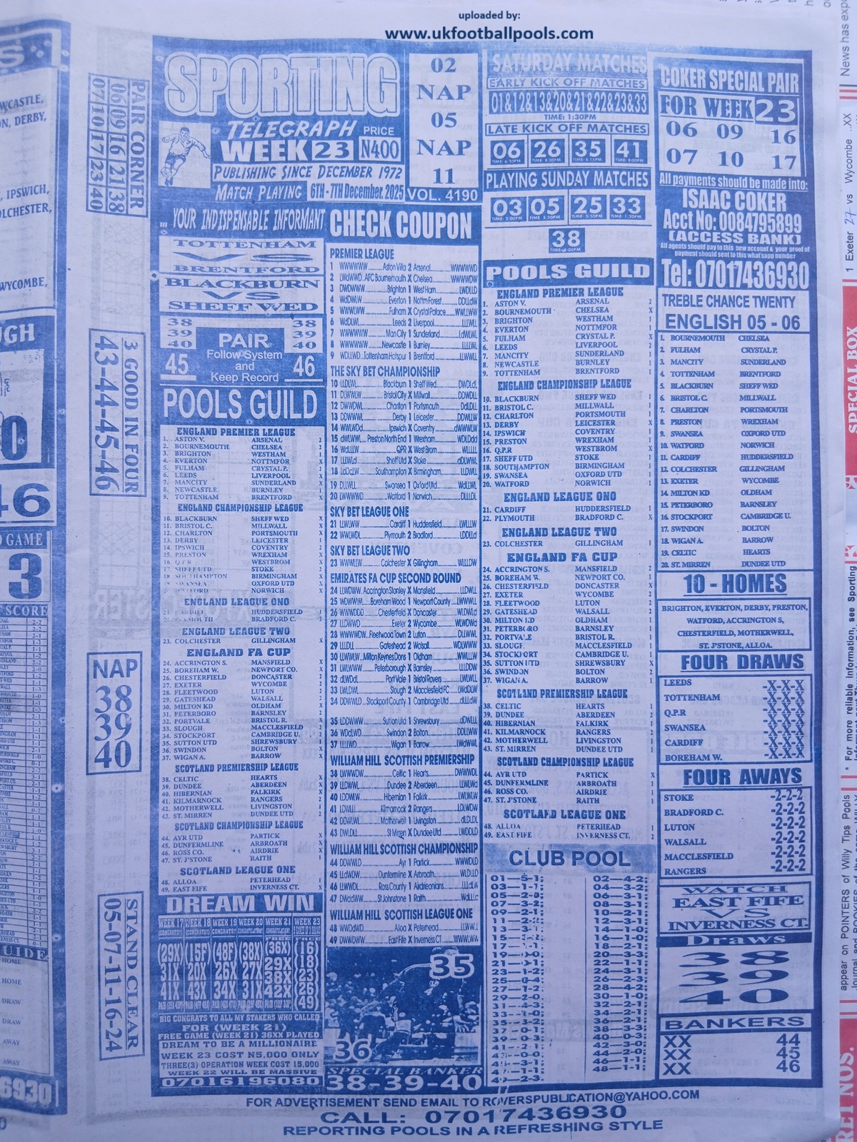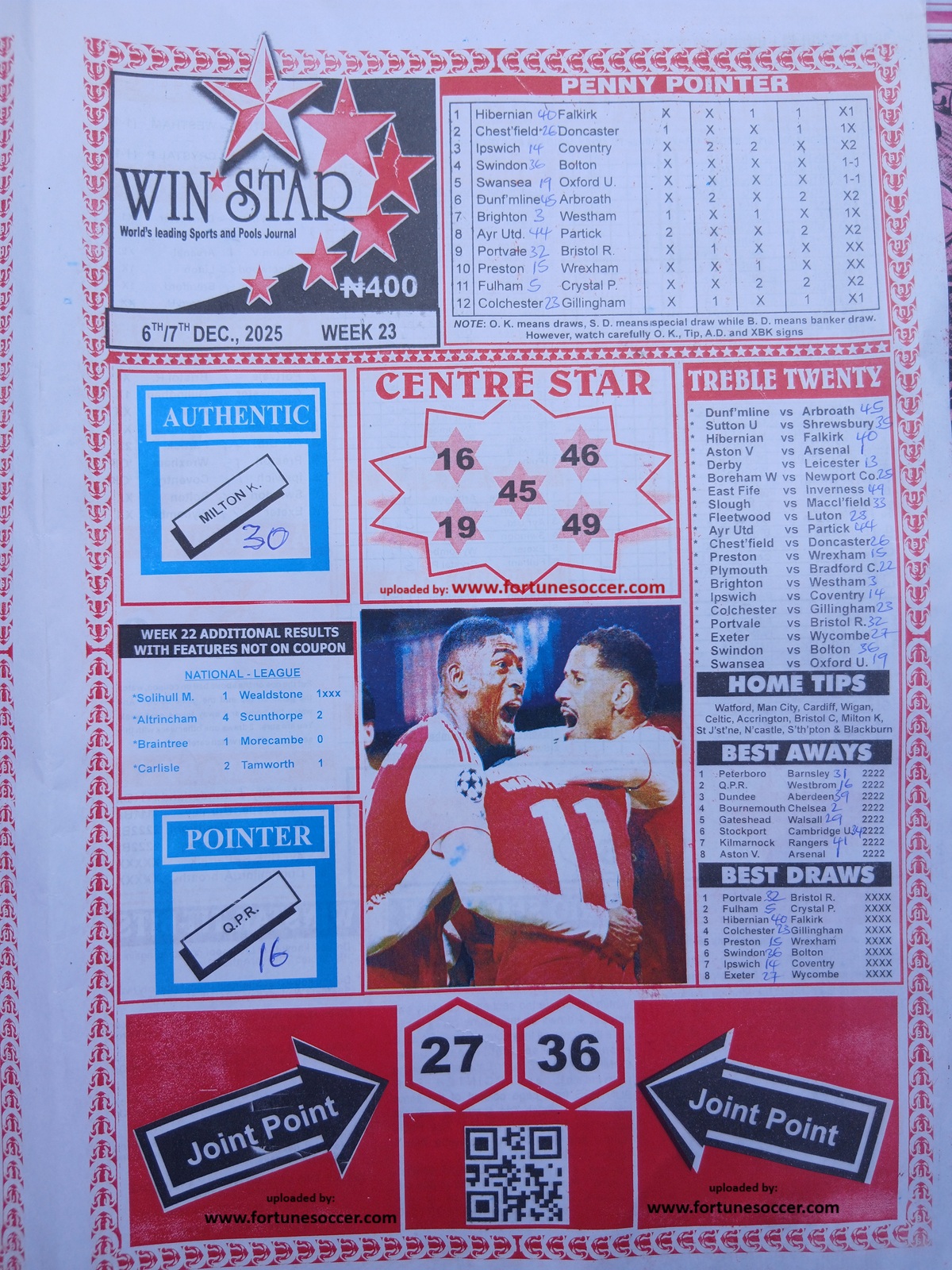 Week 23 Pool Late News Papers 2025: Sport Officer, Soccer Standard for matches scheduled on Saturday, 06 Dec 2025, in the UK 2025/2026 season.