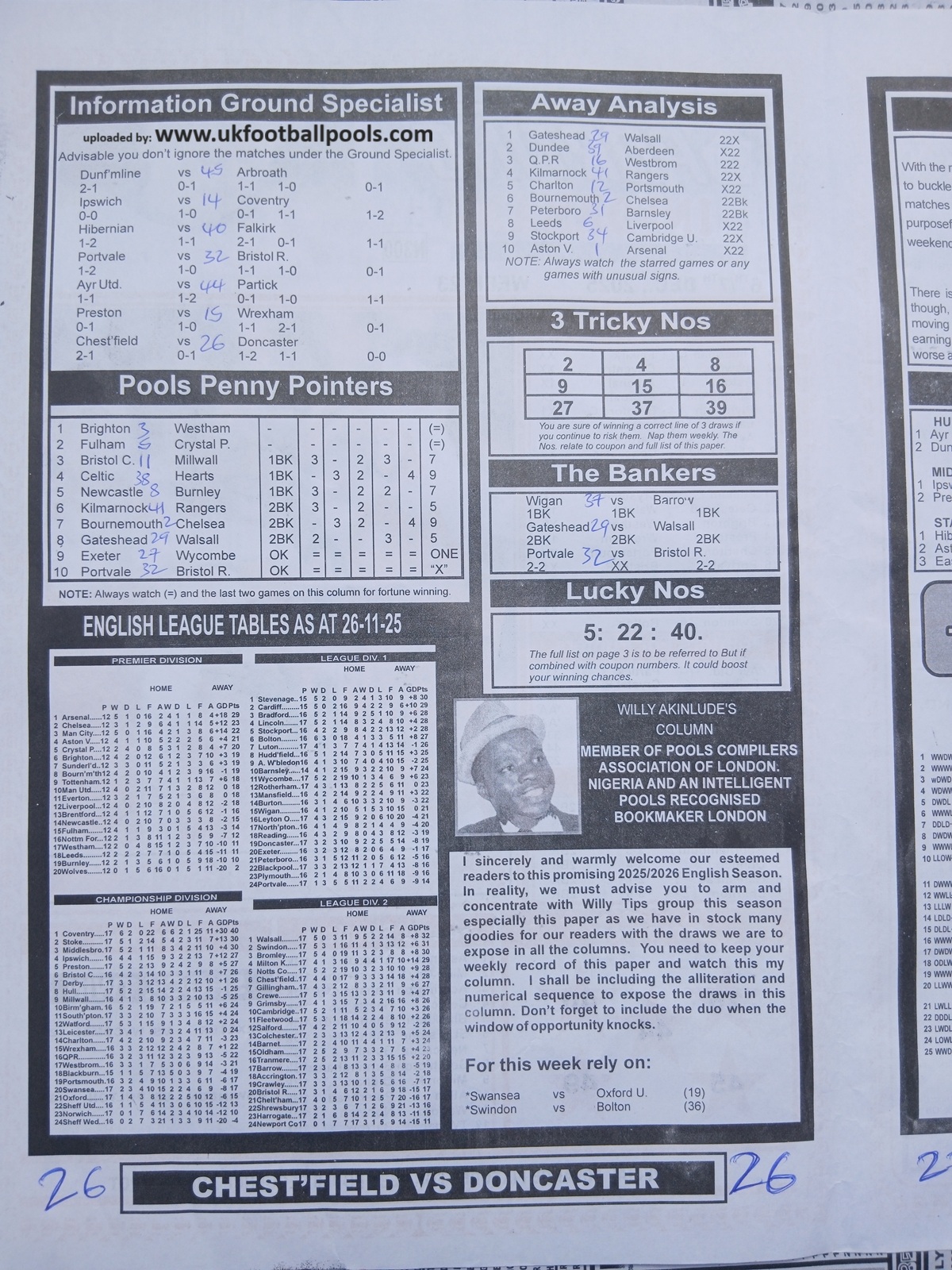 - Current Week 26 Pool Results for Sat, Dec 28 2025 - UK 2024/2025 Pools