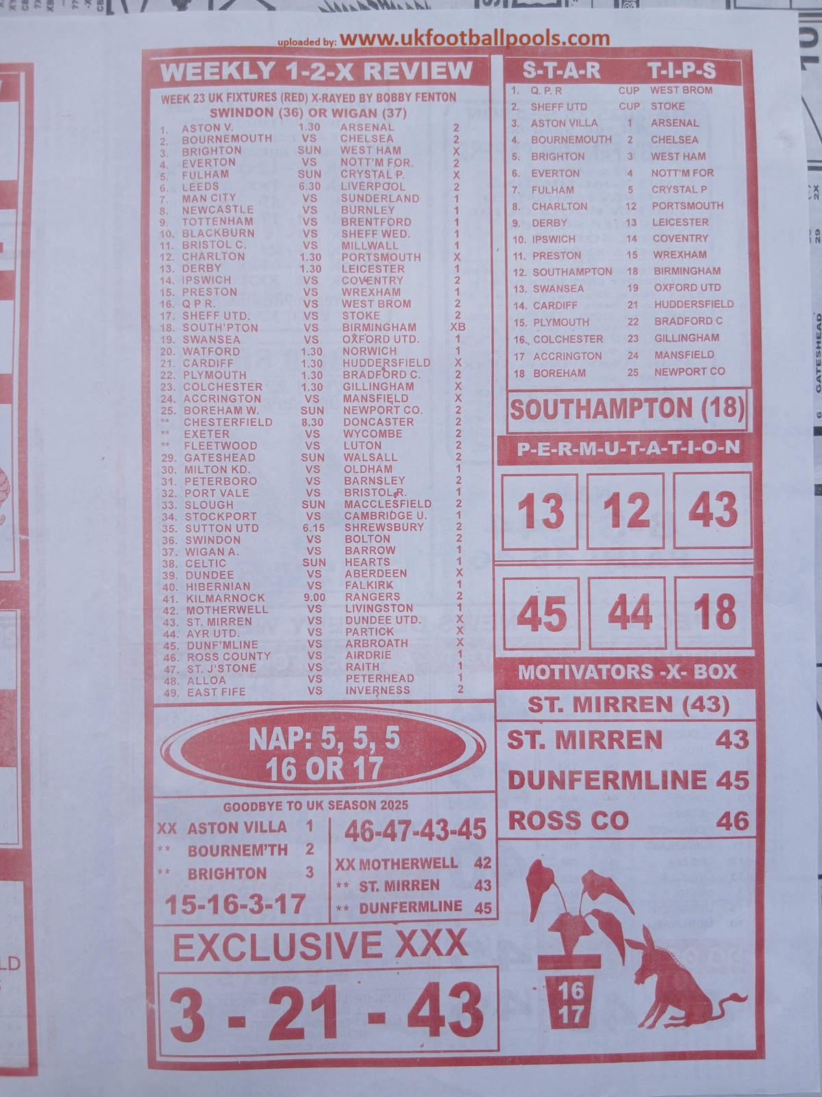 - Avoid overcrowded favorites: If Weekly Telegraph or Mirror shows a heavy public bias, avoid overplaying that line in multiple tickets.