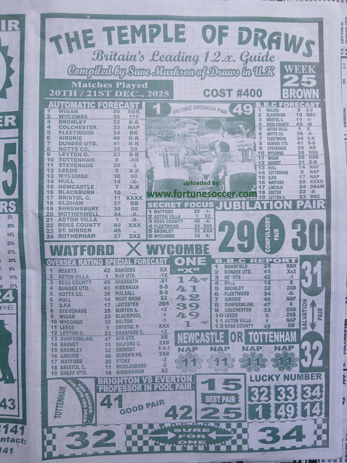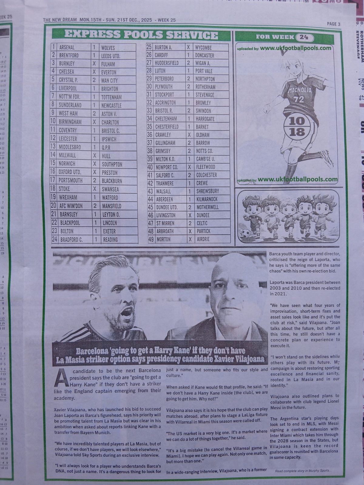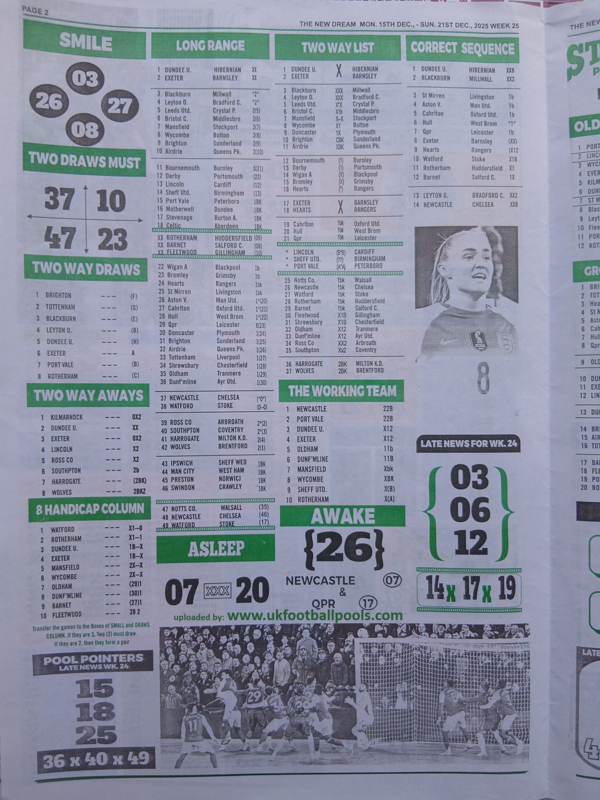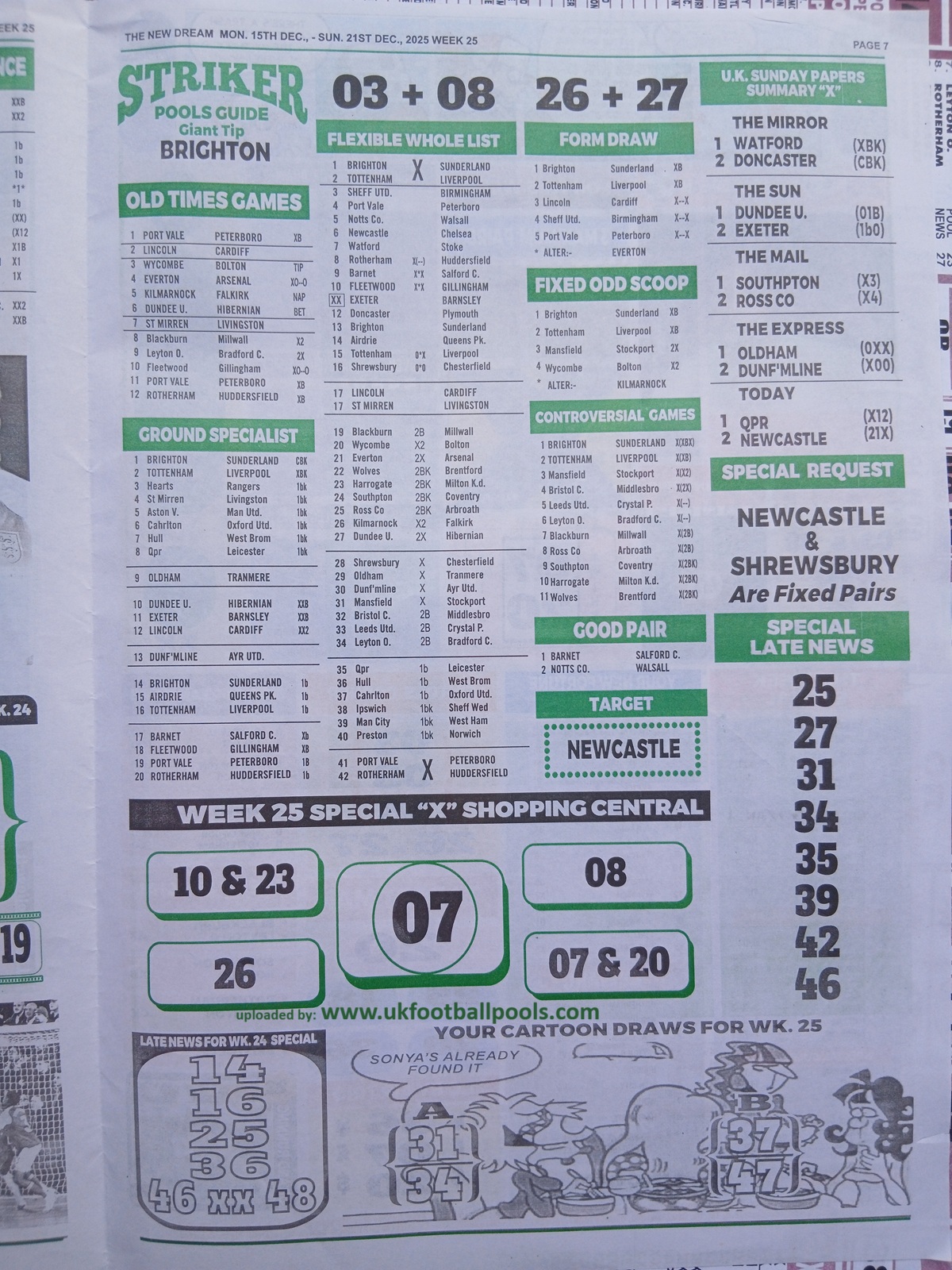 Week 25 Pool Late News Papers for matches scheduled on Saturday, 20 Dec 2025, in the UK 2025/2026 season.