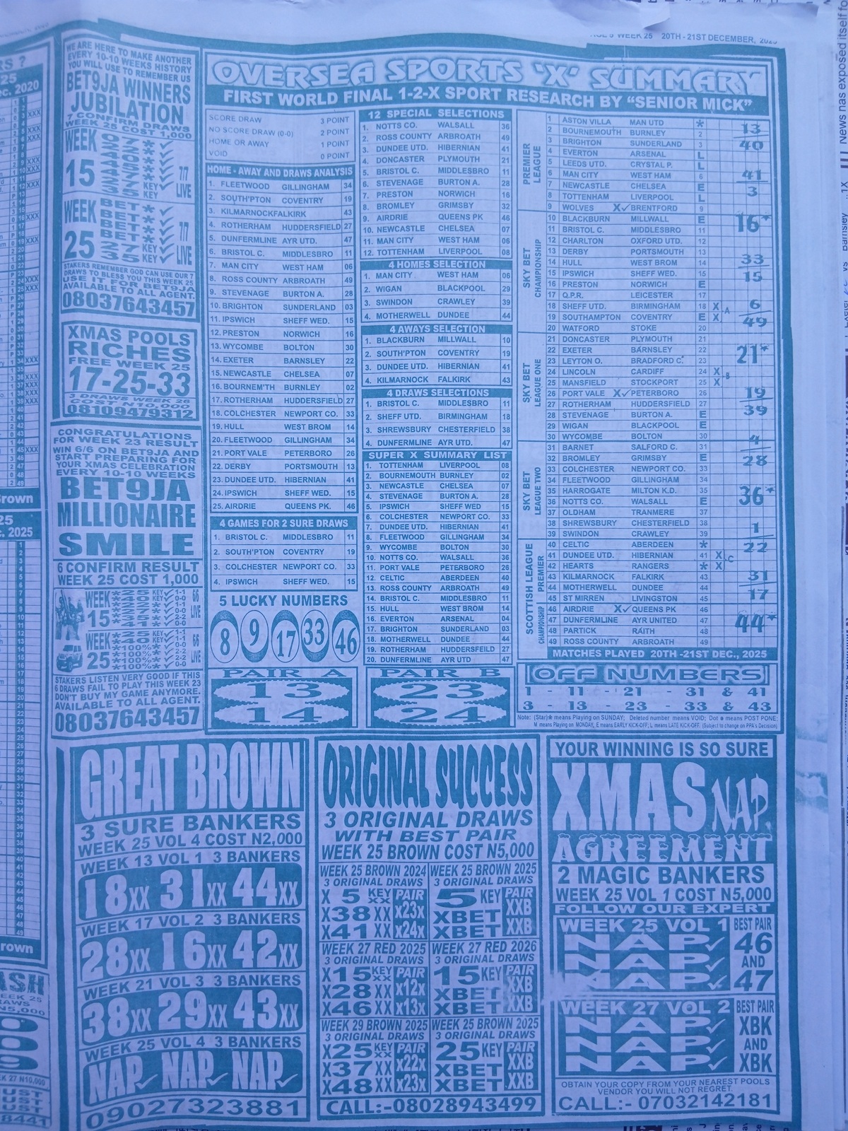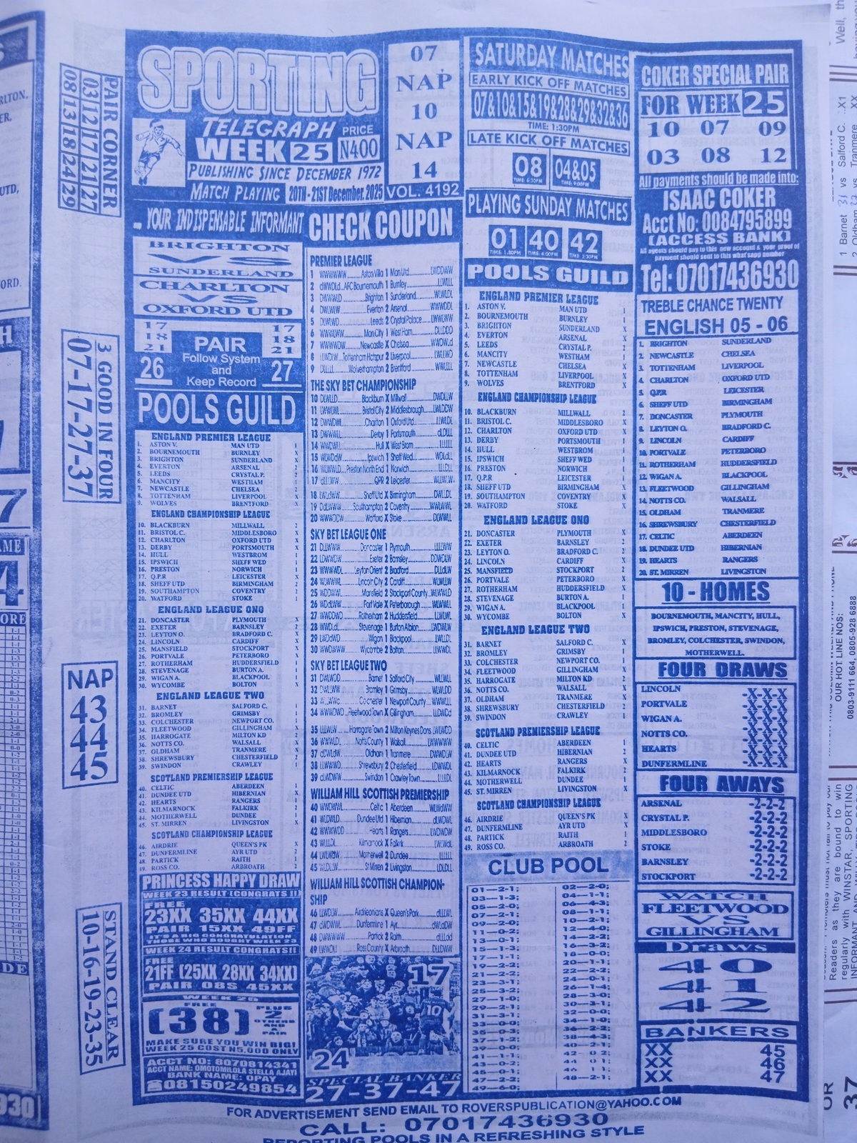 Week 25 Pool Late News Papers 2025: Sport Officer, Soccer Standard for matches scheduled on Saturday, 20 Dec 2025, in the UK 2025/2026 season.