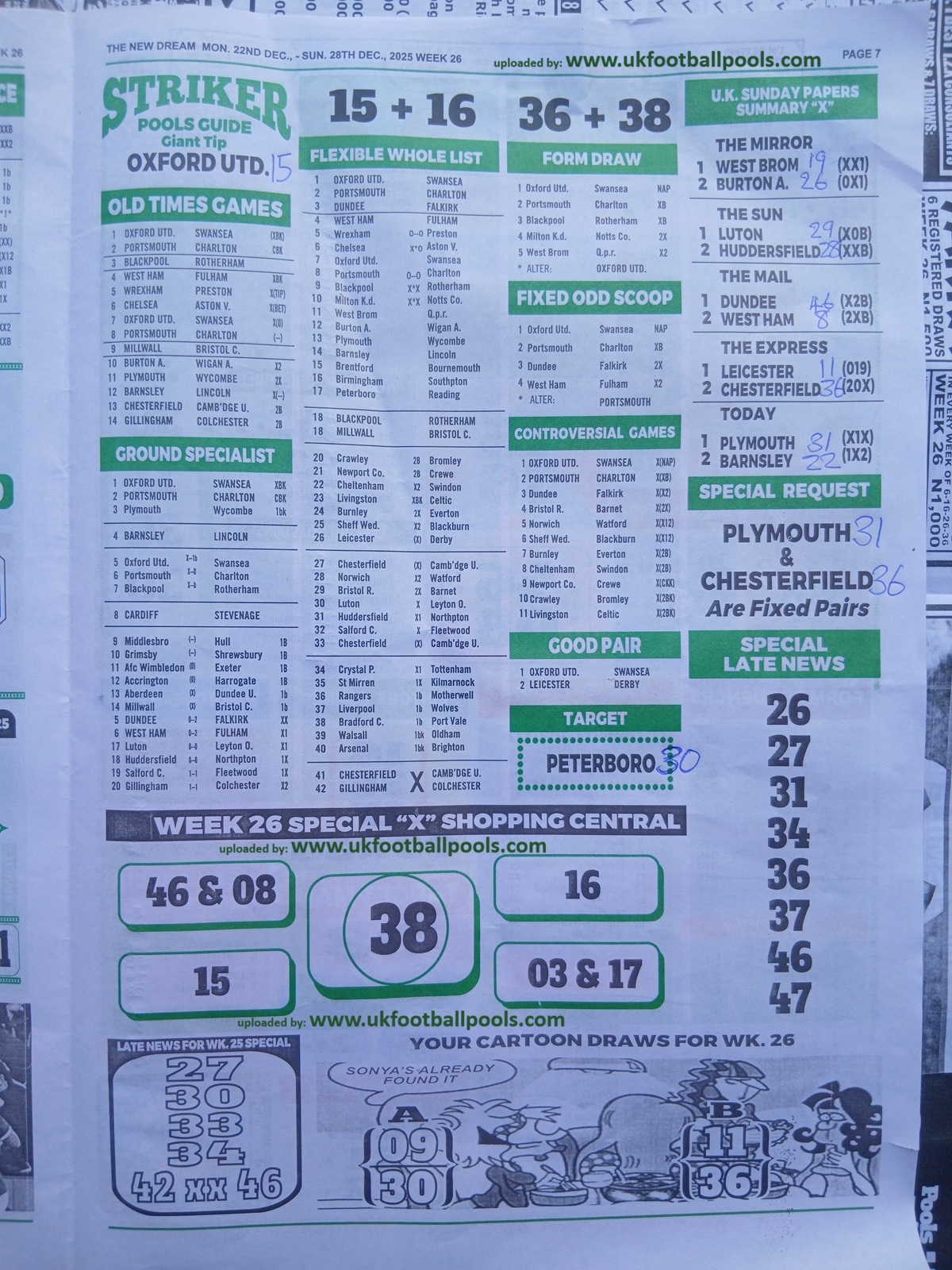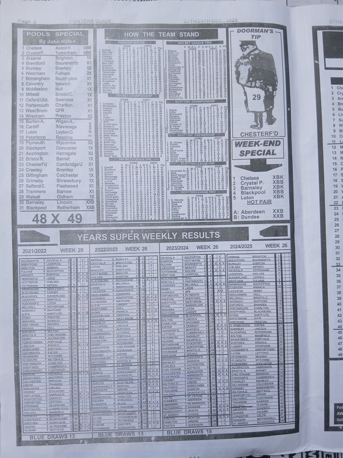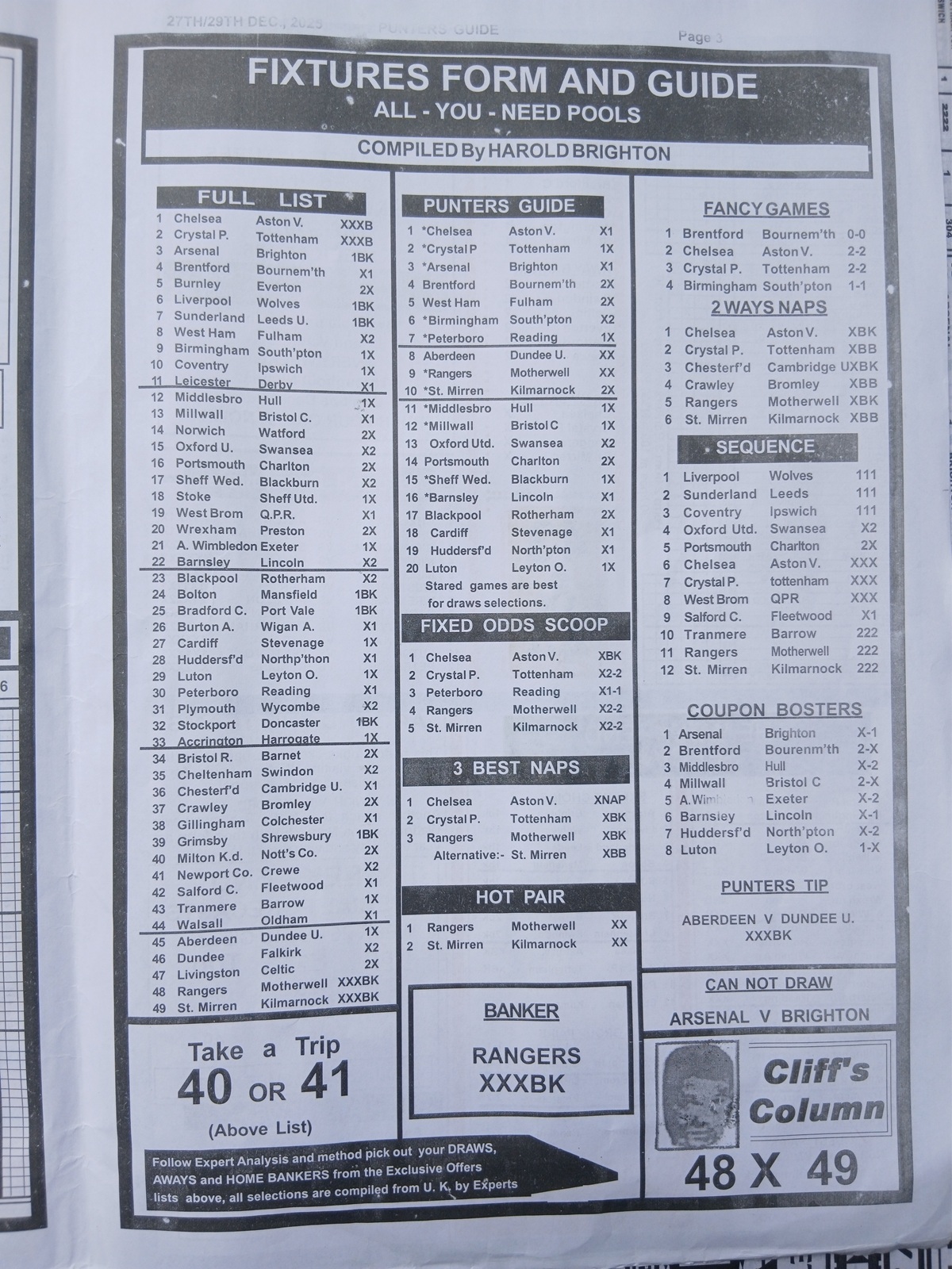 Week 26 Pool Late News Papers for matches scheduled on Saturday, 27 Dec 2025, in the UK 2025/2026 season.