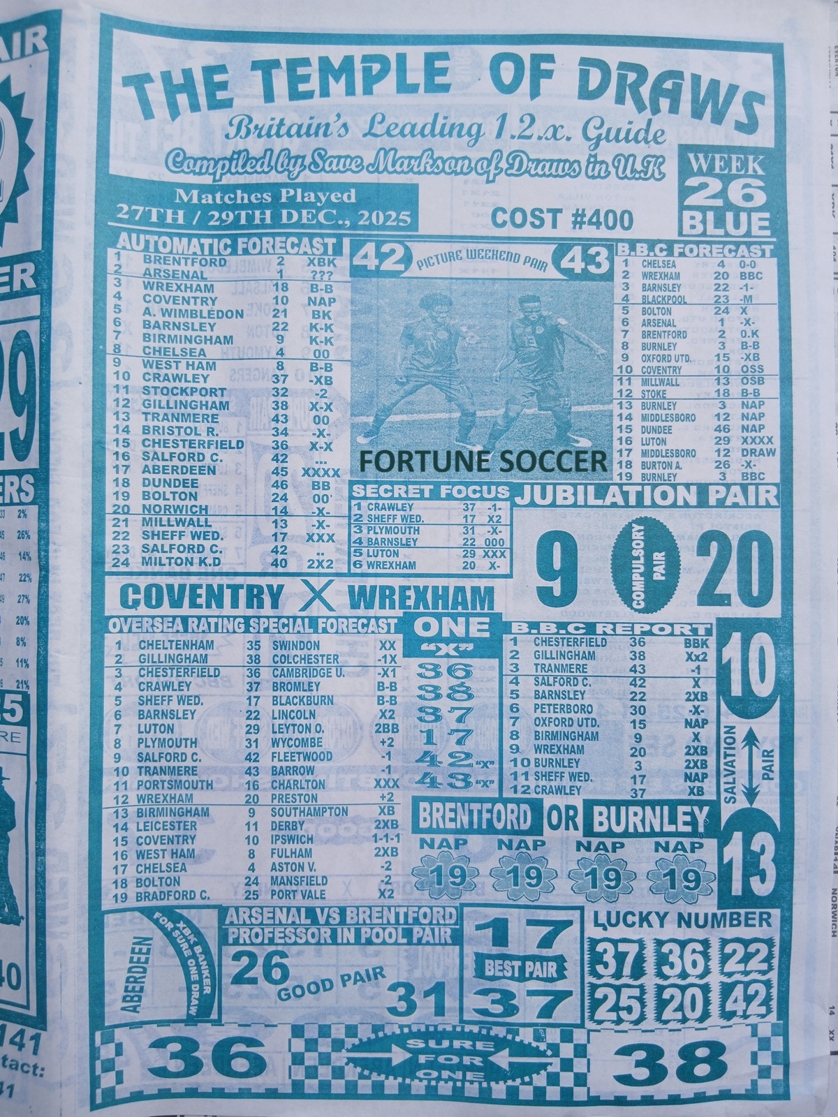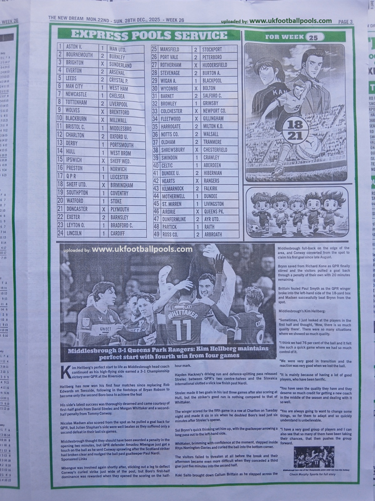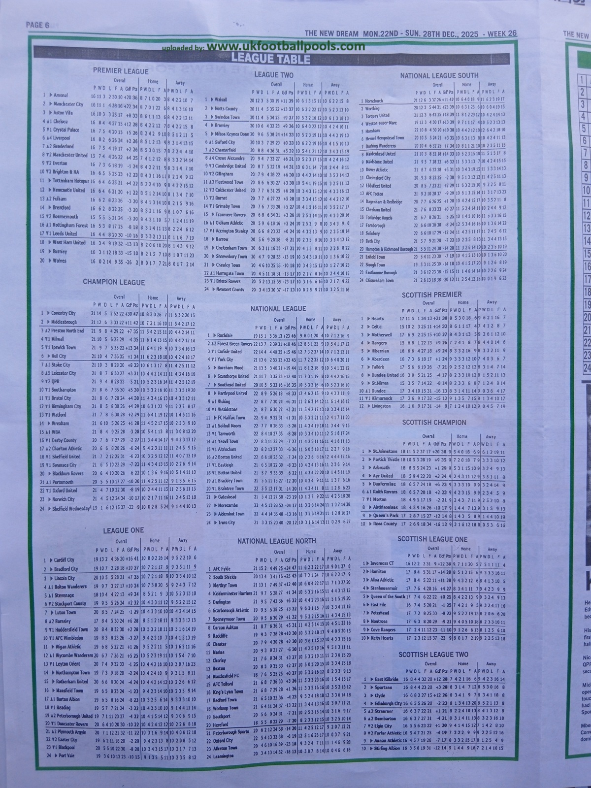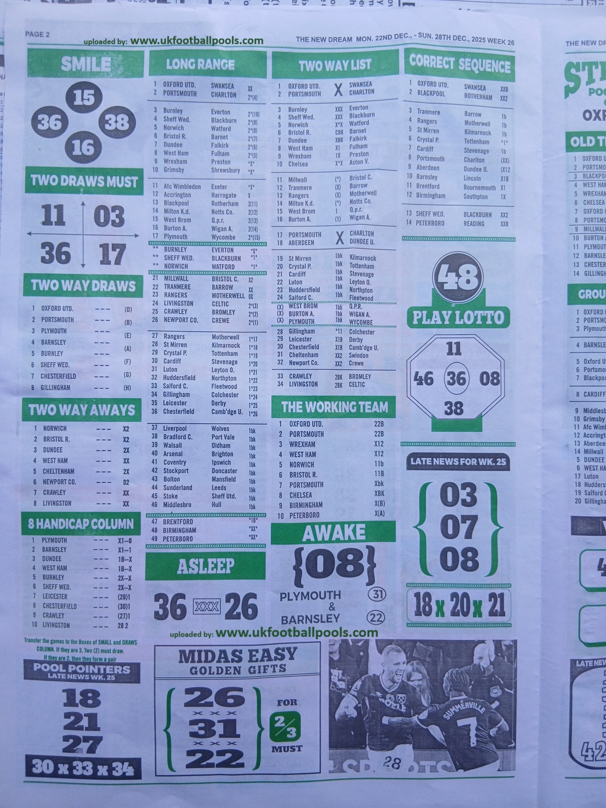 Week 26 Pool Late News Papers for matches scheduled on Saturday, 27 Dec 2025, in the UK 2025/2026 season.
