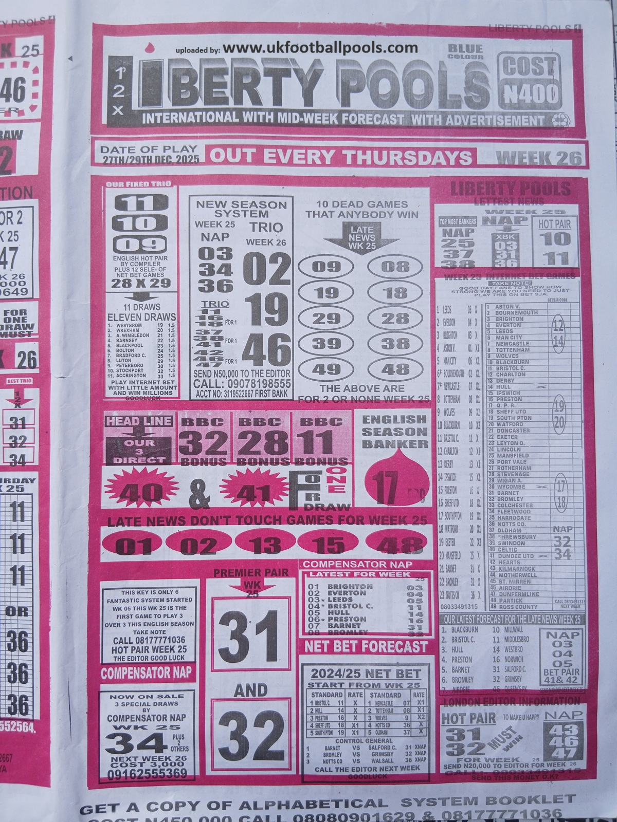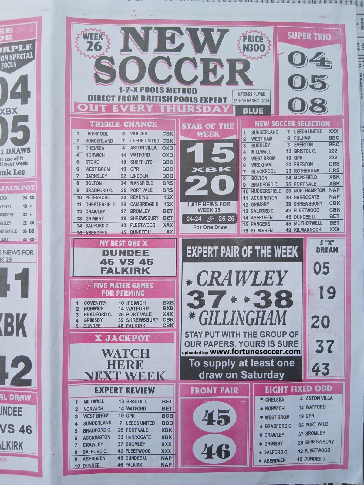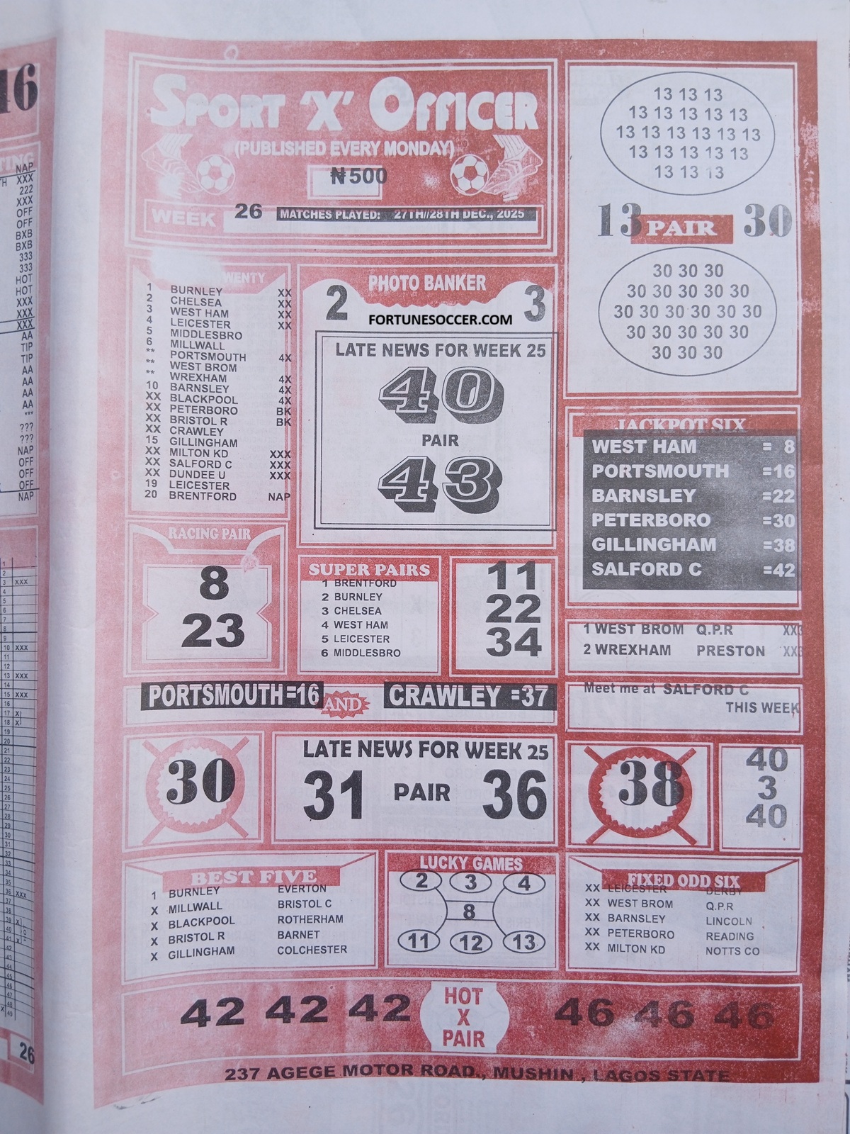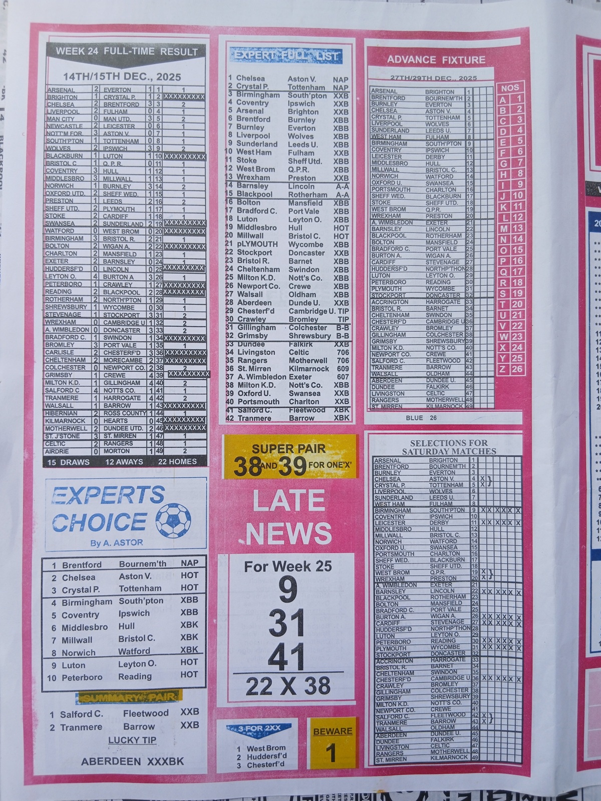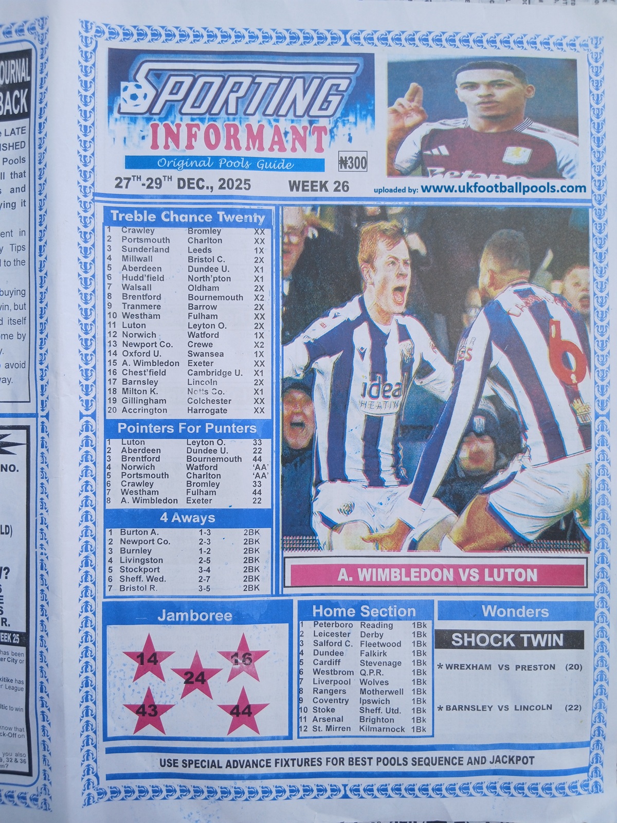 Week 26 Pool Late News Papers 2025: Sport Officer, Soccer Standard for matches scheduled on Saturday, 27 Dec 2025, in the UK 2025/2026 season.