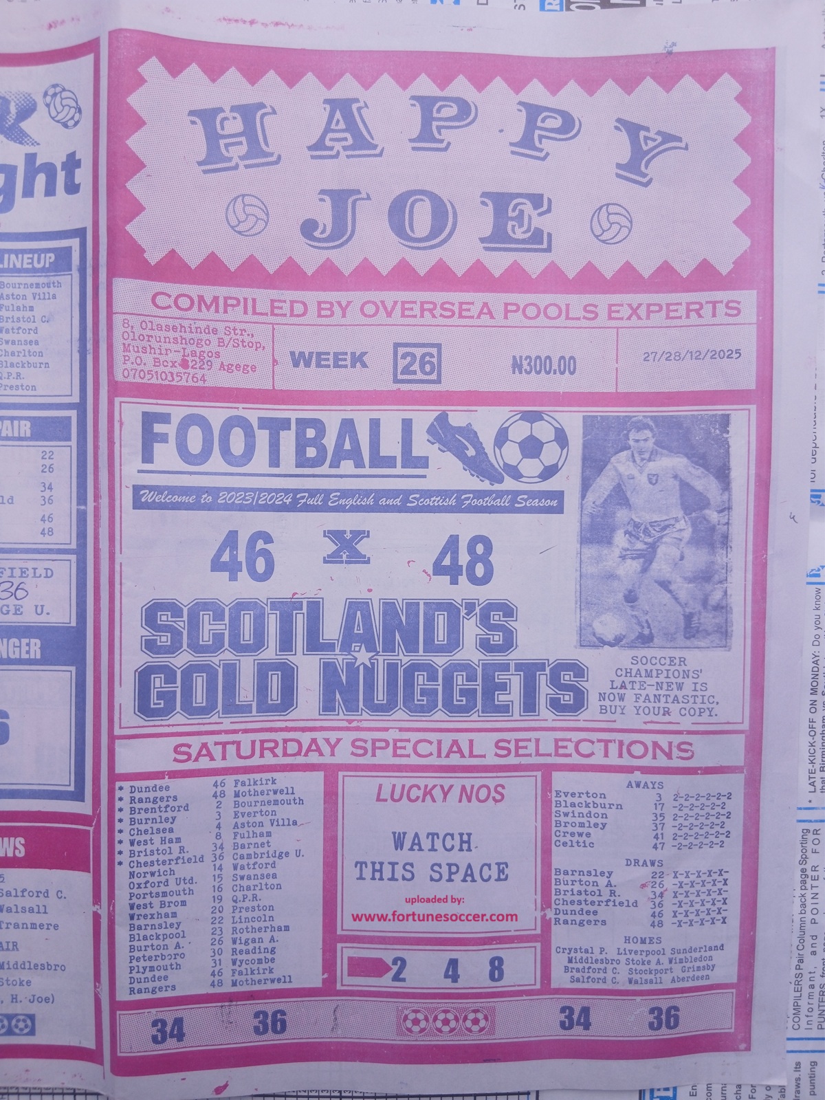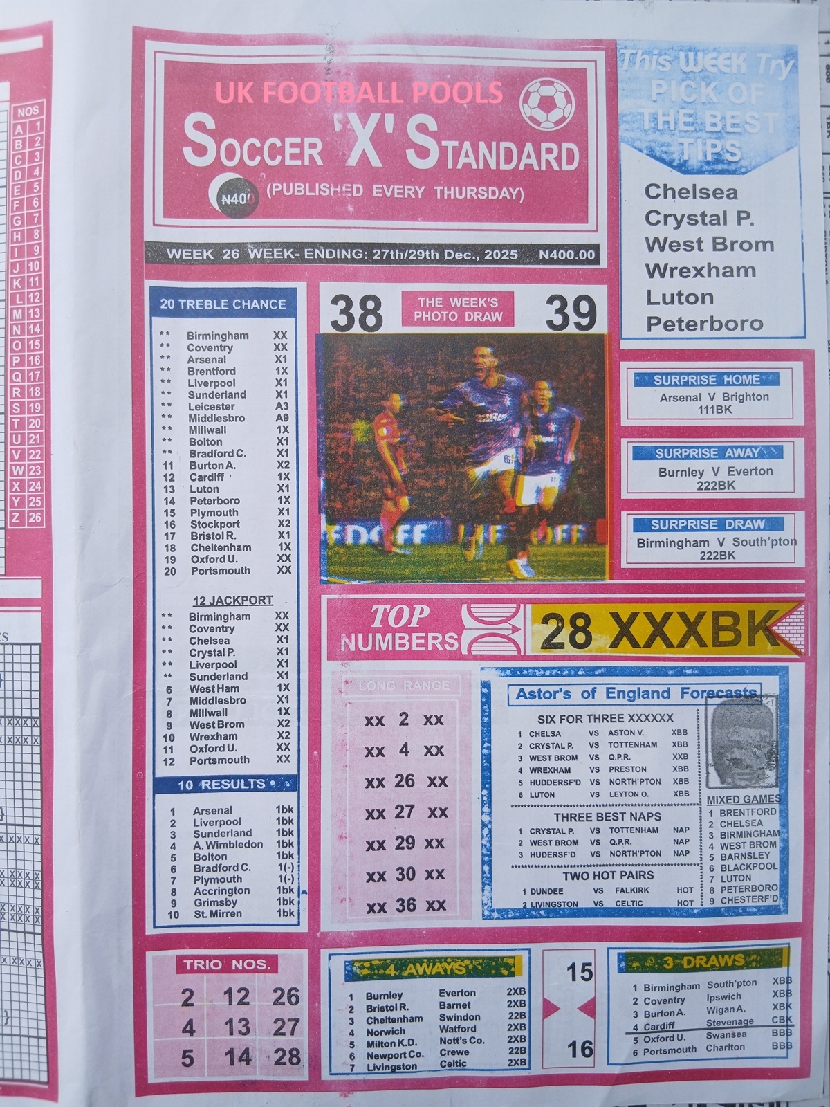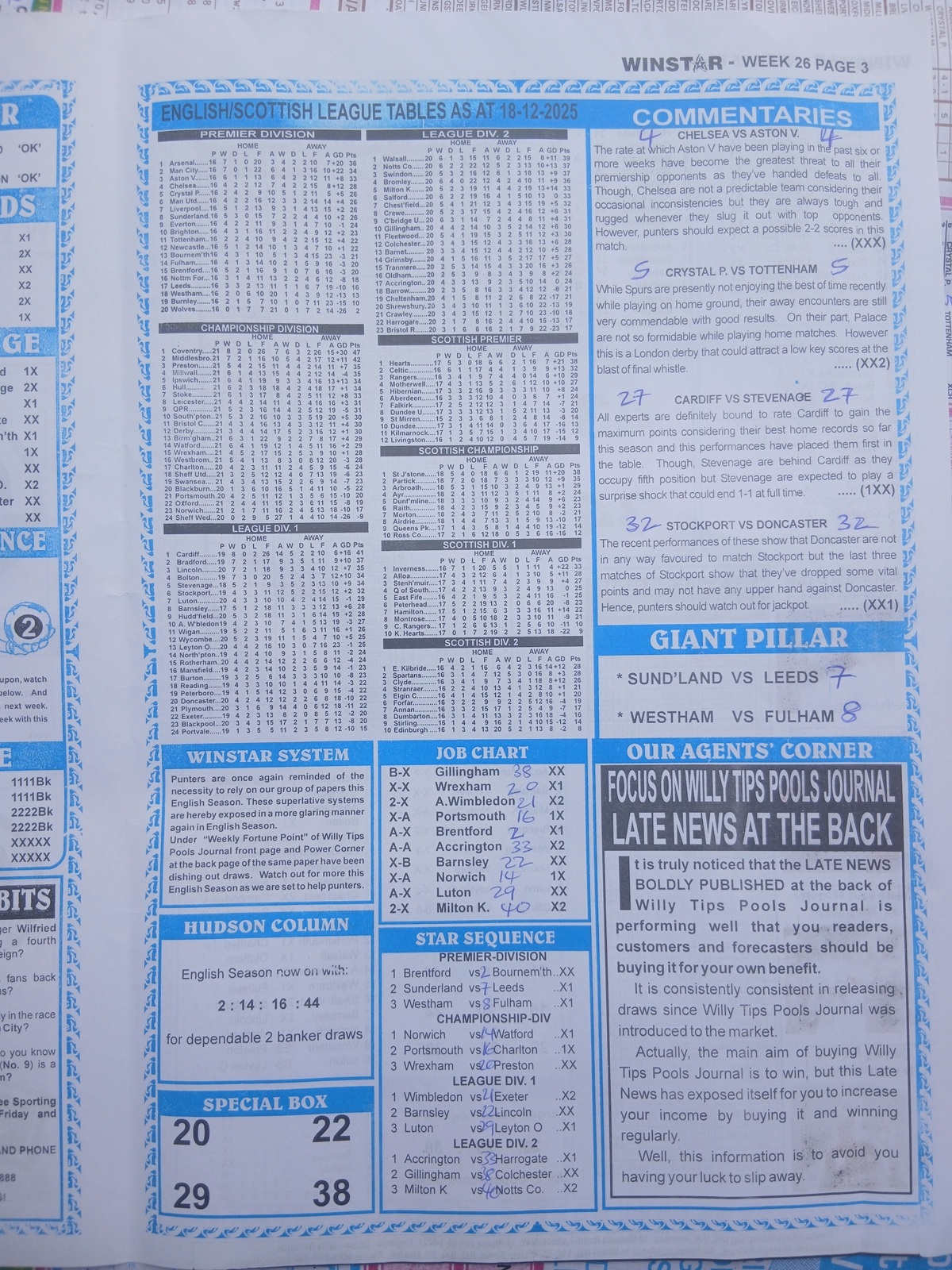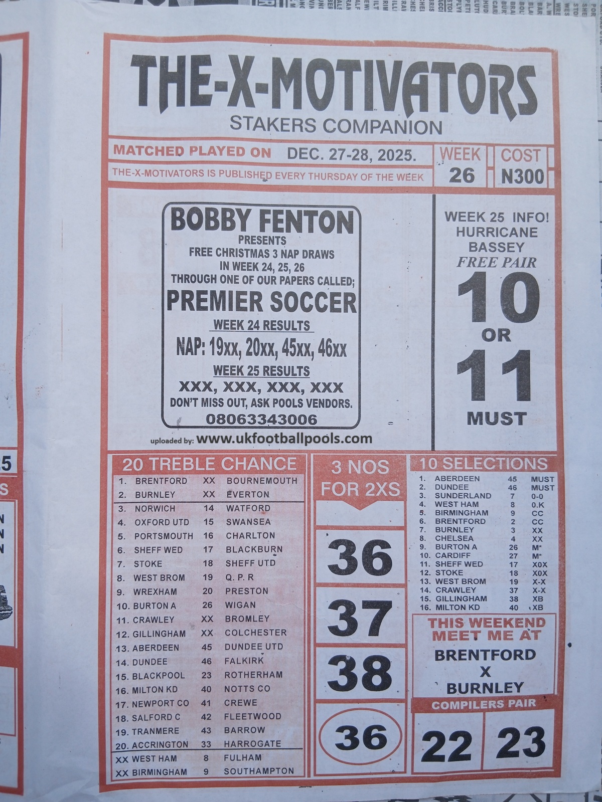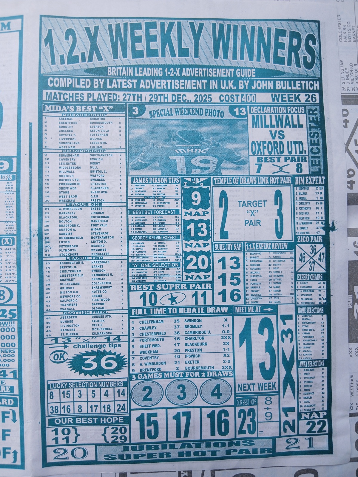 Week 26 Pool Late News Papers 2025: Sport Officer, Soccer Standard for matches scheduled on Saturday, 27 Dec 2025, in the UK 2025/2026 season.
