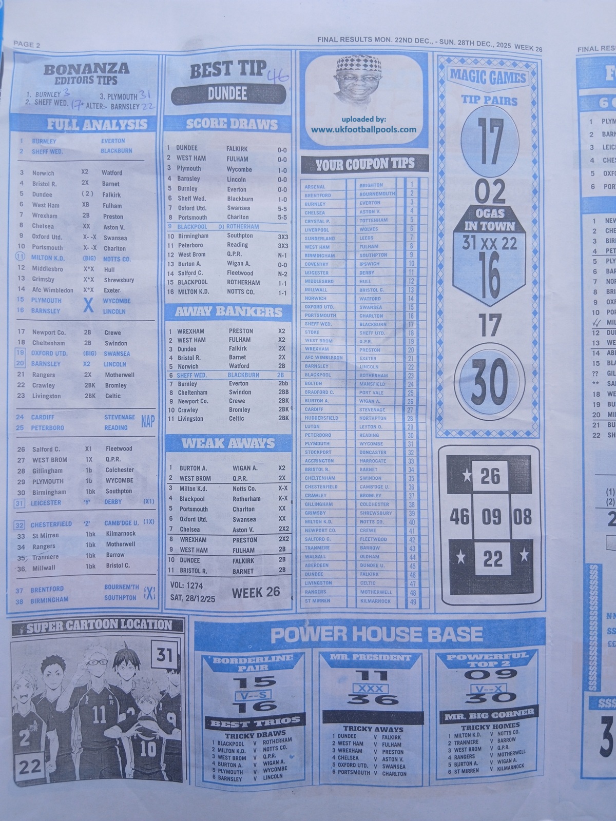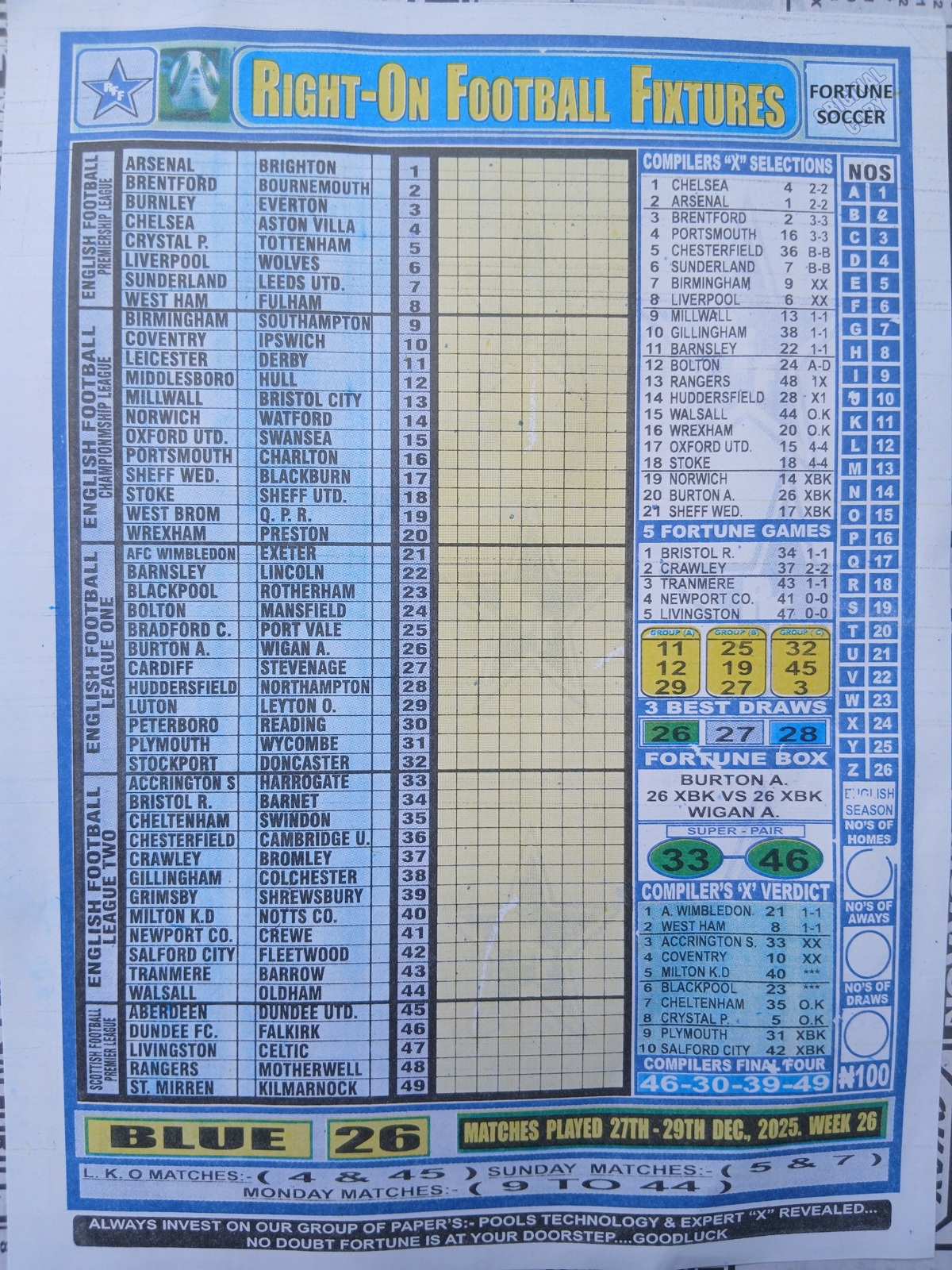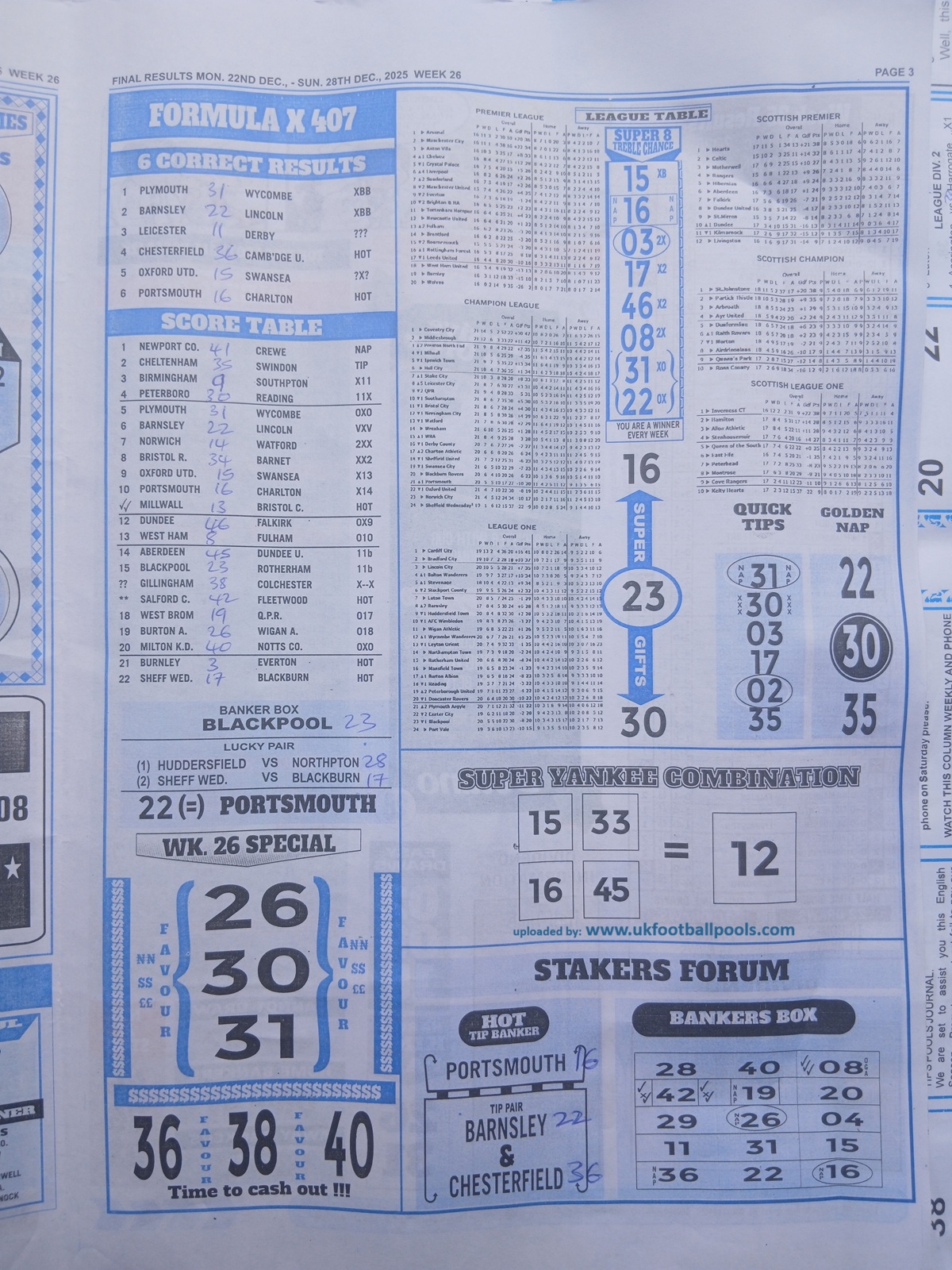 - Current Week 26 Pool Results 2025 For Sat, Dec 27 - UK 2025/2026 Pools