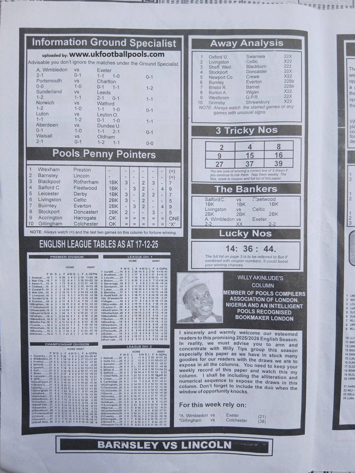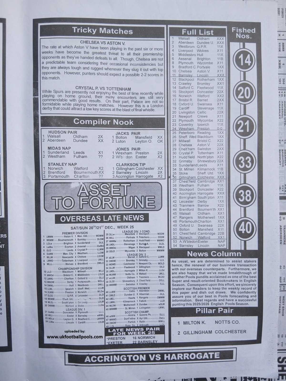 - Current Week 25 Pool Results 2025 For Sat, Dec 20 - UK 2025/2026 Pools