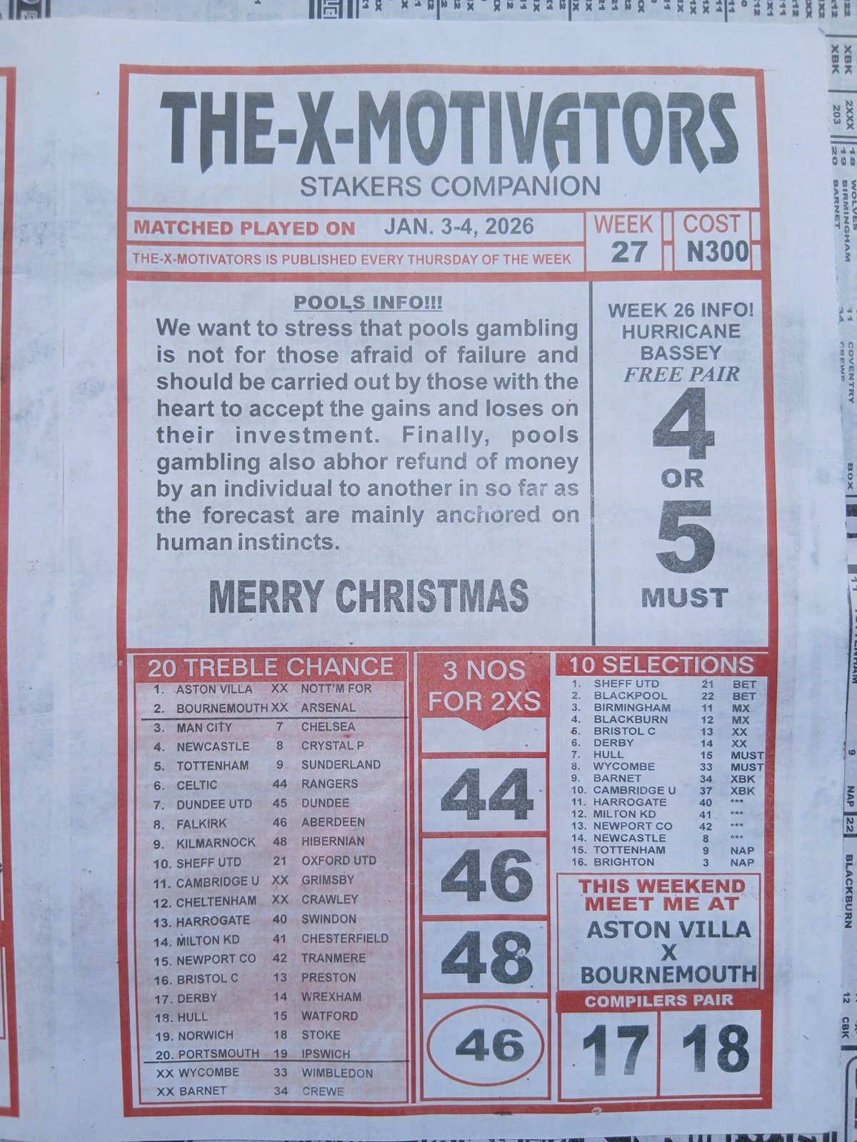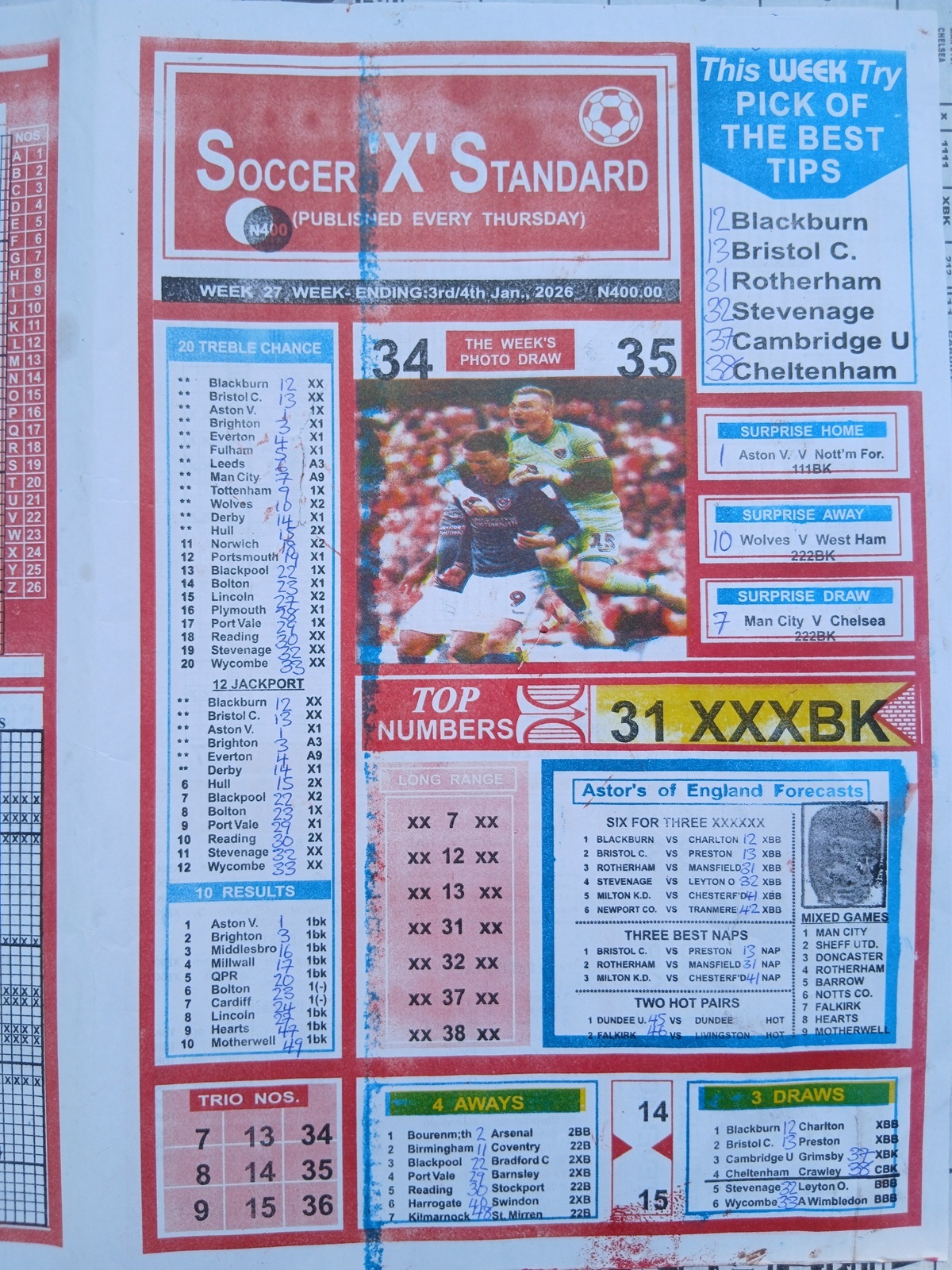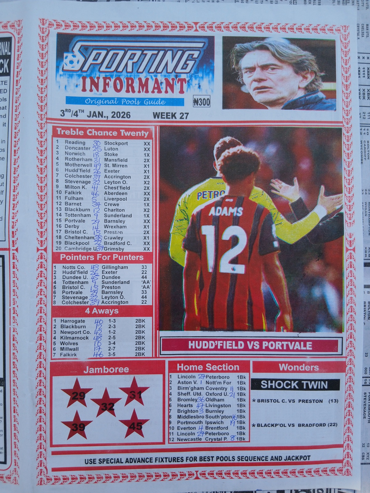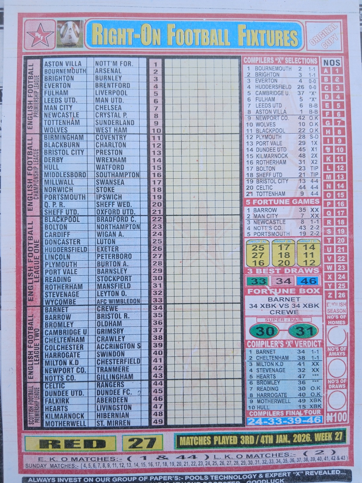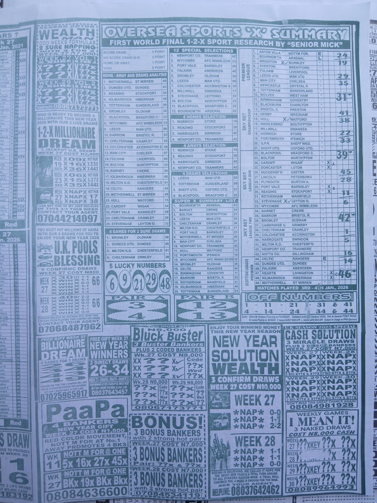 Week 27 Pool Late News Papers 2026: Sport Officer, Soccer Standard for matches scheduled on Saturday, 03 Jan 2026, in the UK 2025/2026 season.