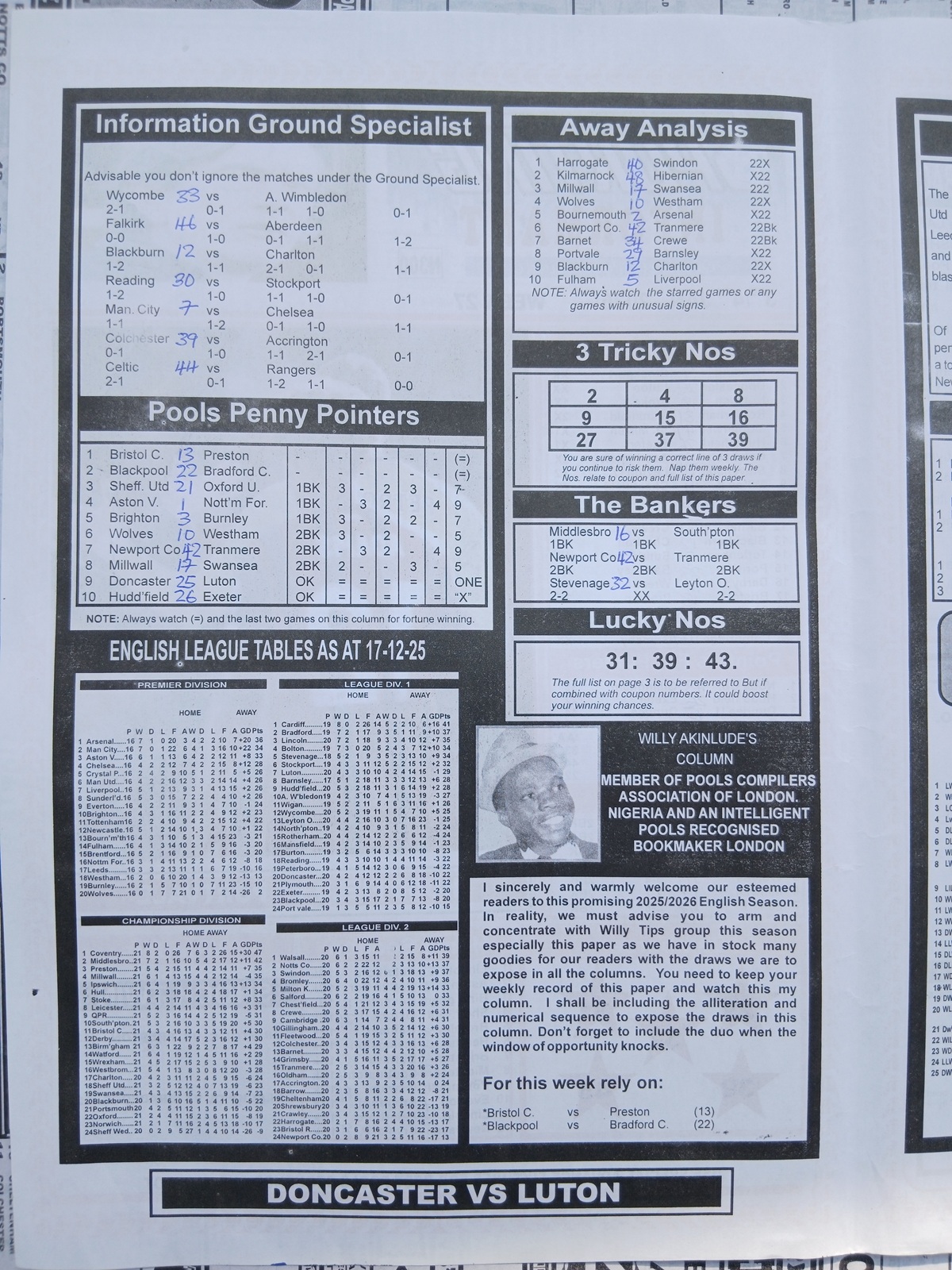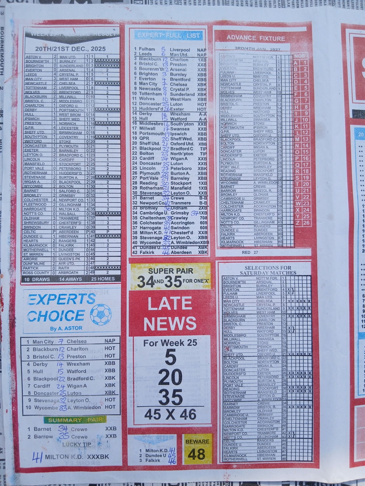 - Current Week 25 Pool Results 2025 For Sat, Dec 20 - UK 2025/2026 Pools