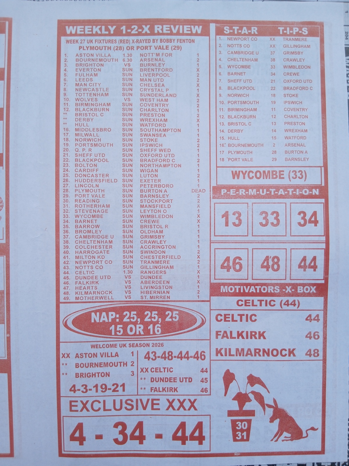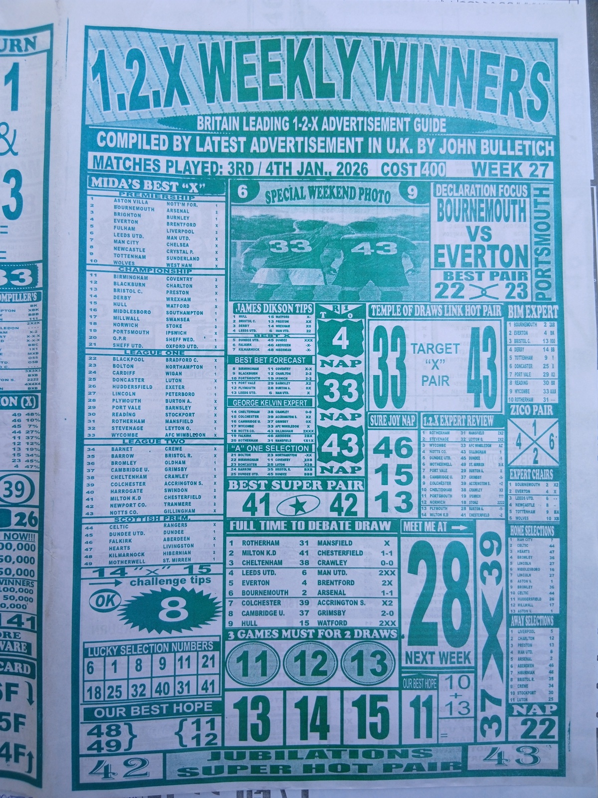 - Avoid overcrowded favorites: If Weekly Telegraph or Mirror shows a heavy public bias, avoid overplaying that line in multiple tickets.