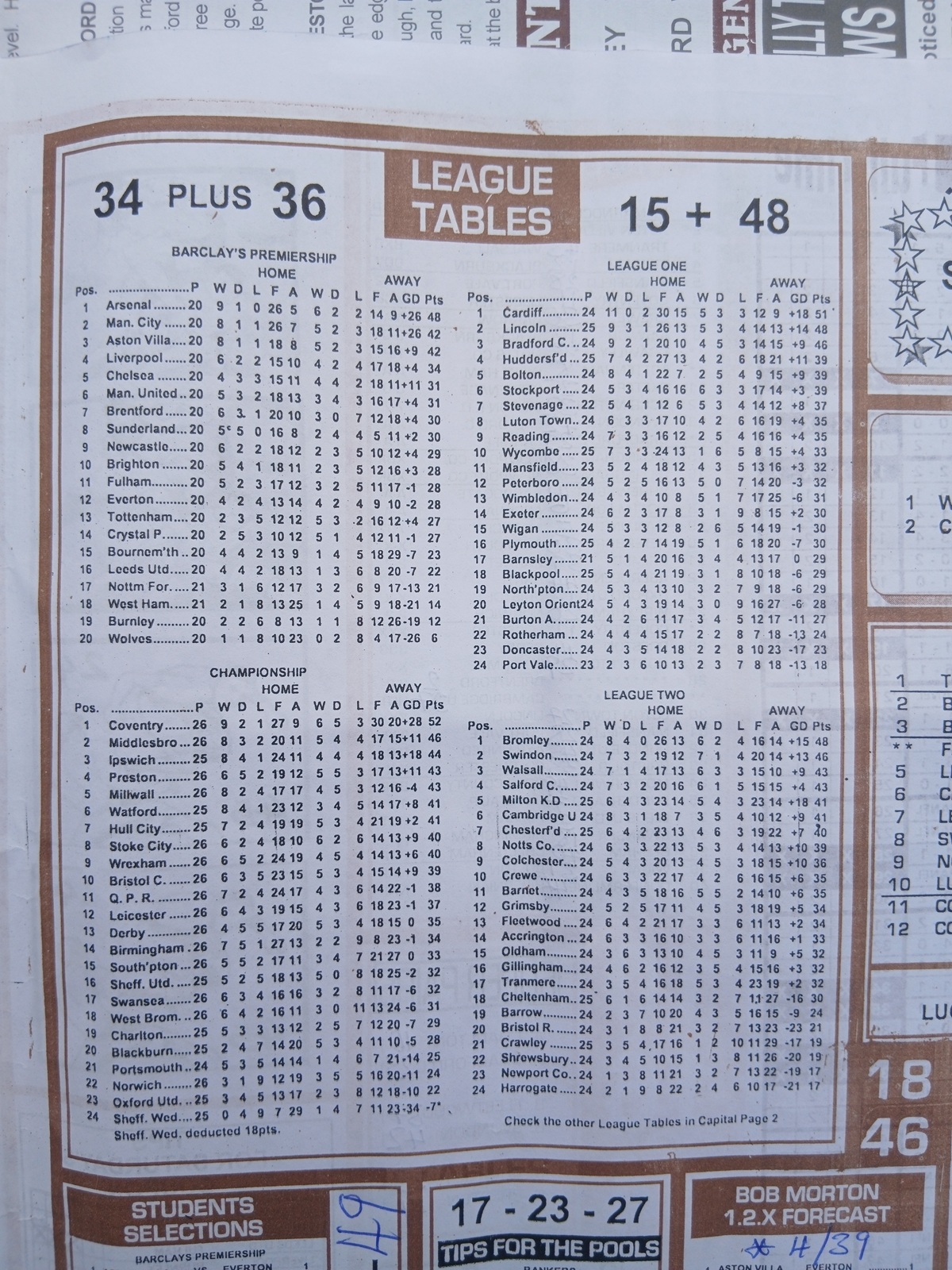 SOCCER PERCENTAGE, CAPITAL AND WINSTAR LEAGUE TABLE