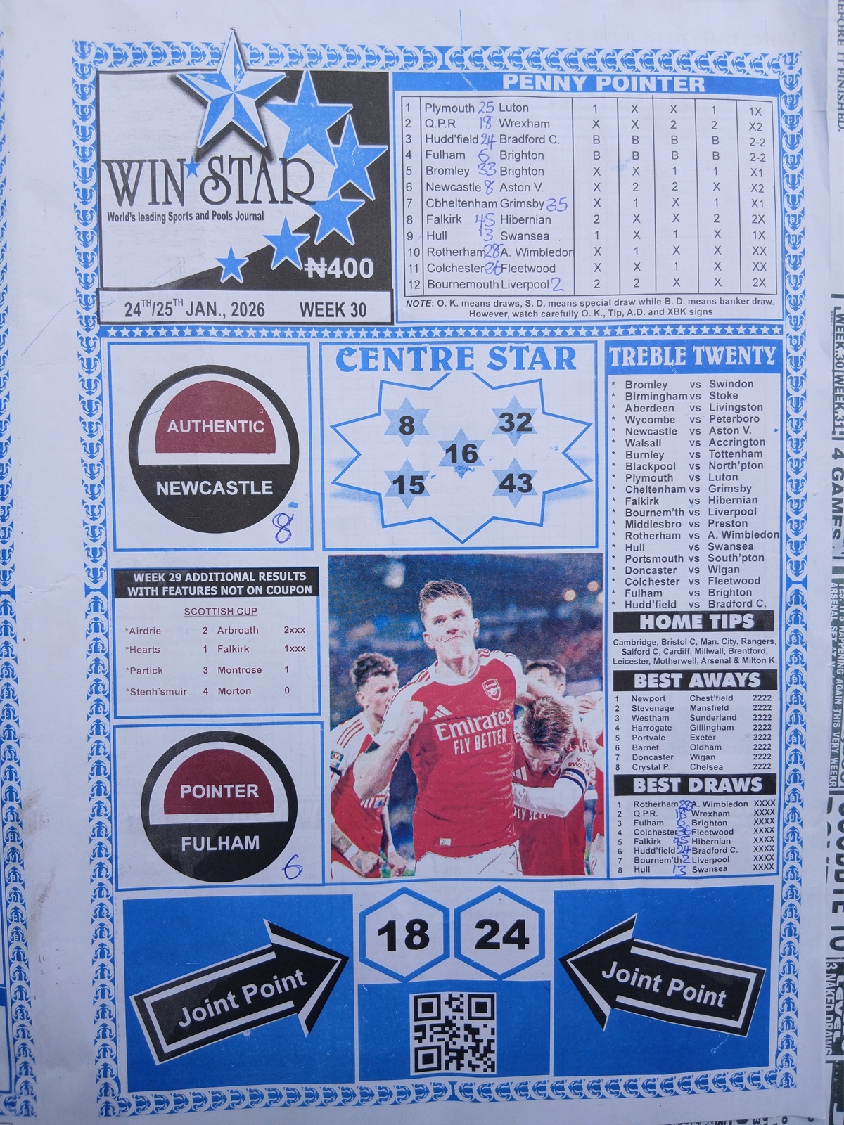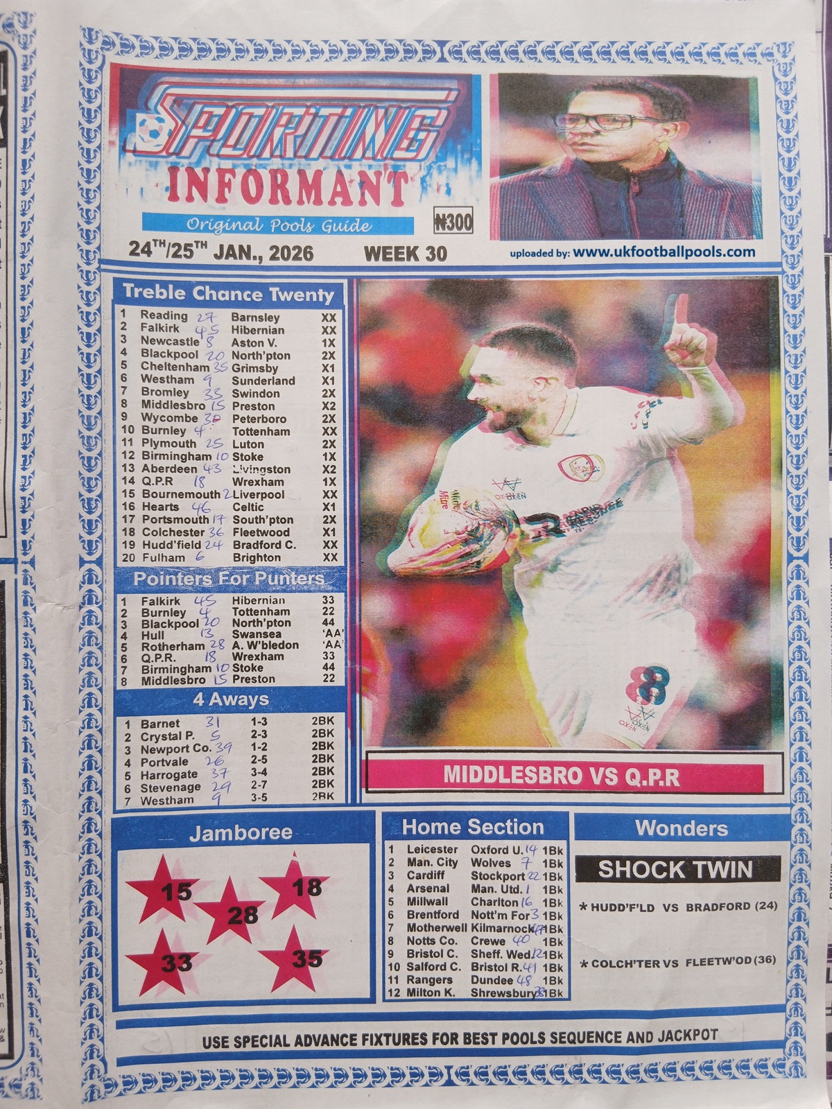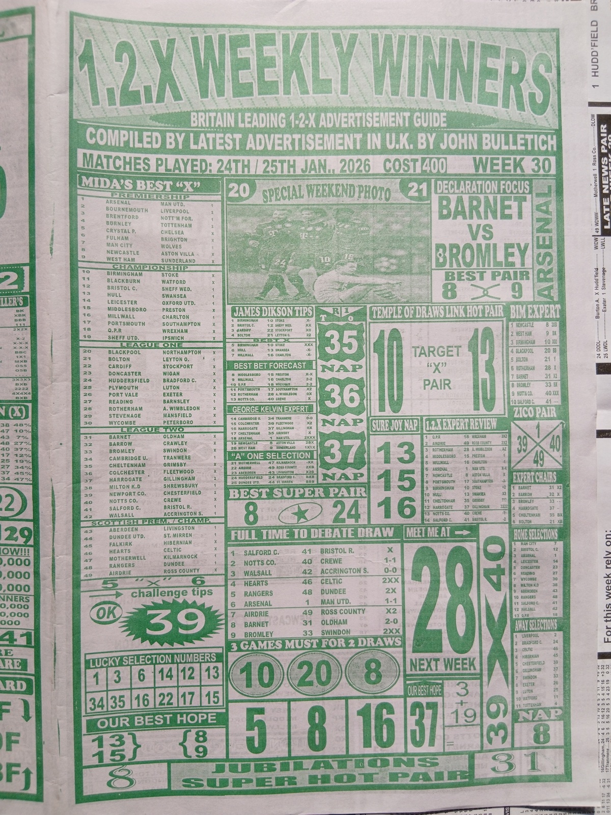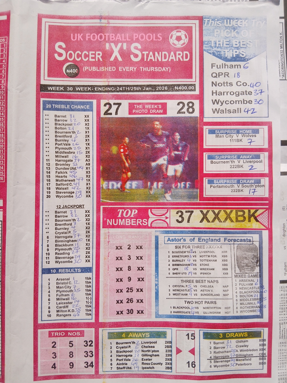 Week 30 Pool Late News Papers 2026: Sport Officer, Soccer Standard for matches scheduled on Saturday, 24 Jan 2026, in the UK 2025/2026 season.